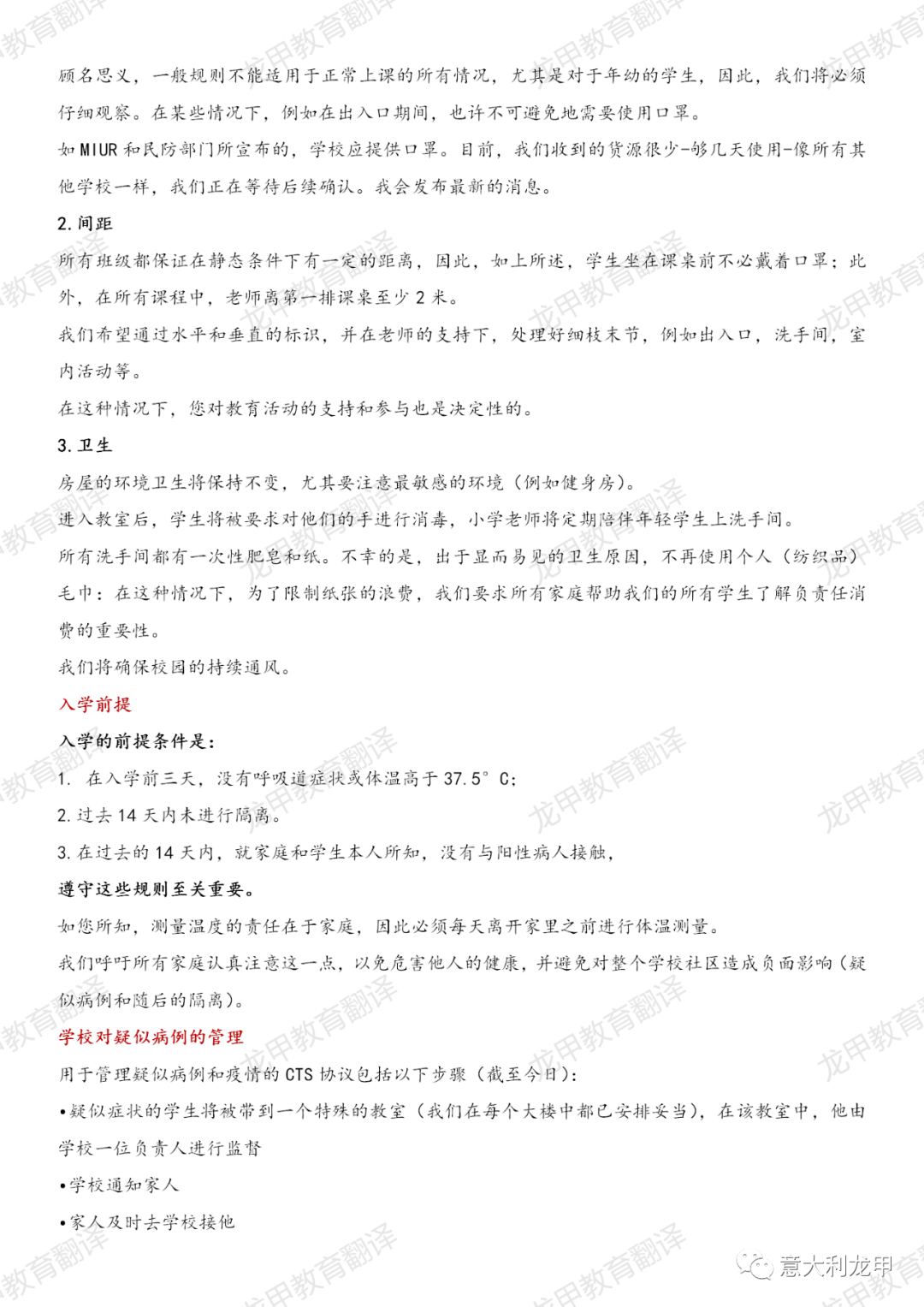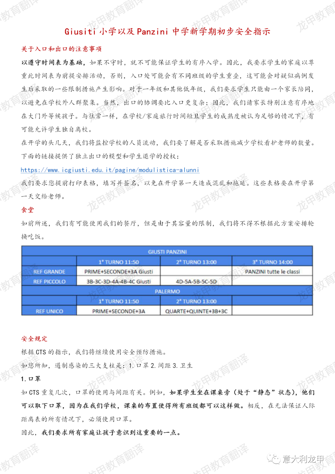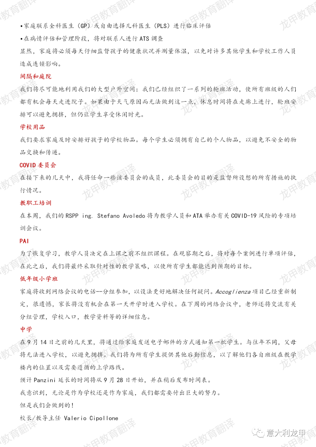 以下附上由龙甲教育意大利语部文静老师协助GIUSTI小学、PANZINI中学整理翻译的新学期开学初步指示。