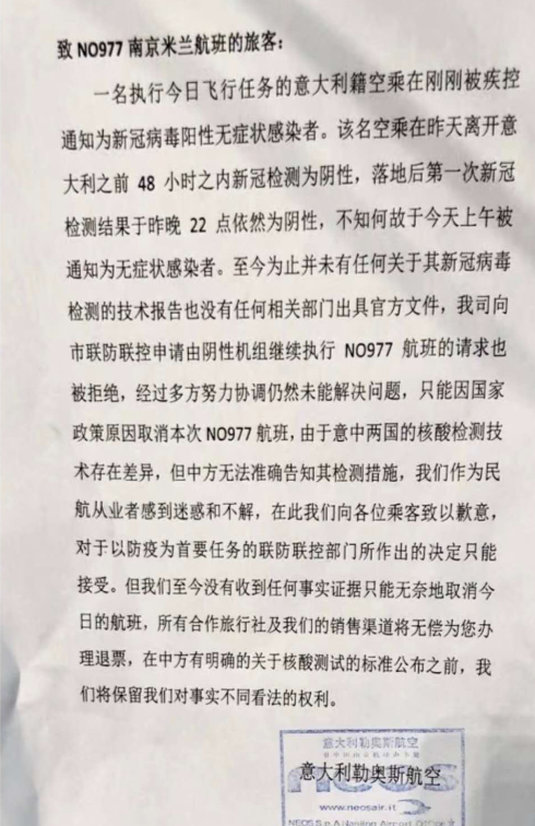 一名执行今日飞行任务的意大利籍空乘在刚刚被疾控通知为新冠病毒阳性无症状感染者。该名空乘在昨天离开意大利之前48小时内新冠检测为阴性,(在南京)落地后第一次芯管检测结果于昨晚22点依然为阴性,不知何故于今天上午被通知为无症状感染者。至今为止并未有任何关于其新冠病毒检测的技术报告也没有任何相关部门出具官方文件,我司向市联控办申请由阴性机组继续执行N0977航班的请求也被拒绝,经过多方努力协调仍然未能解决问题,只能因国家政策原因取消本次NO977航班,由于意中两国的核酸检测技术存在差异,但中方无法准确告知其检测措施,我们作为民航从业者感到迷惑和不解,在此,我们向各位乘客致以歉意,对于以防疫为首要任务的联防联控部门所作出的决定只能接受。但我们至今没有收到任何事实证据只能无奈地取消今日的航班,所有合作旅行社及我们的销售渠道将无偿为您办理退票,在中方有明确的关于核酸检测的标准公布之前,我们将保留我们对事实不同看法的权利。