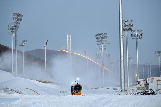12月9日,北京2022年冬奥会张家口赛区国家冬季两项中心附近山上的古长城被灯光点亮。(图片来源:中新社)