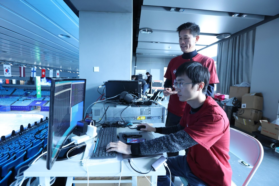 2021年12月11日,“冰雪项目交互式多维度观赛体验技术与系统”项目队员在首都体育馆内测试设备。