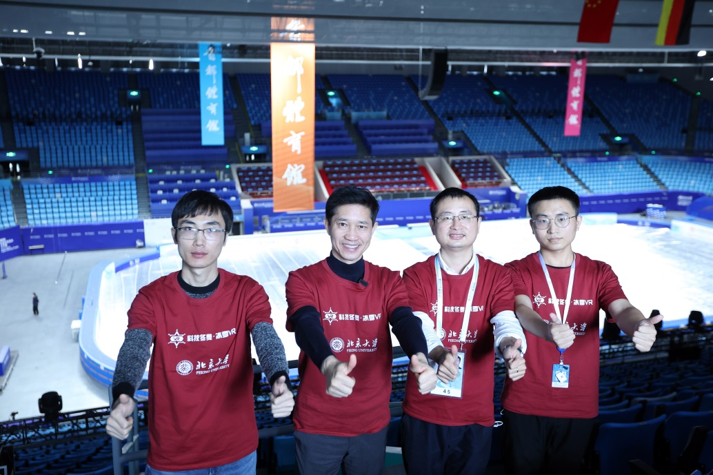 2021年12月11日,“冰雪项目交互式多维度观赛体验技术与系统”项目负责人、北京大学教授陈宝权(左2)与项目团队在首都体育馆内合影。