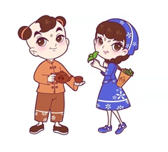 阿福手持一把紫砂壶,阿喜手拿一捧阳羡贡茶,二人的造型象征着宜兴千年的历史沉淀,也代表了如今宜兴的开放包容与谦和大气。