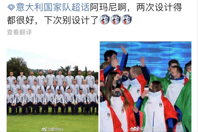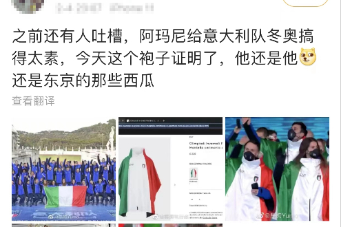 比如,北京冬奥会开幕式上,意大利代表团身披国旗配色的斗篷浩浩荡荡出场,被网友吐槽“还是东京奥运会时那个西瓜”“设计的很好,下次别设计了”。