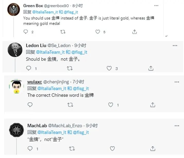 再比如,意大利组合在冰壶混合团体决赛摘金后,意大利代表团兴奋的在社交媒体上发布了一张海报,还特意秀了一把中文,不过,他们把“金牌”两字写成了“金子”,引来众多热心网民纠正。