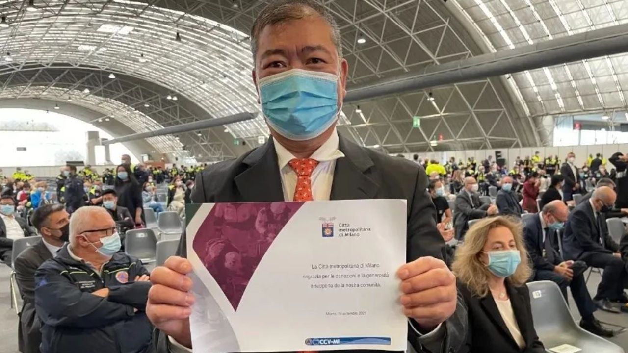 2021年9月19日,米兰市长qiuseppe sala先生在米兰郊外novigro展览馆举行了盛大的(感谢)表彰大会,向在2020年2月爆发的这场突发而持久的抗击“新冠肺炎”病毒感染战役中作出重要贡献的所有爱心人士公开致谢。