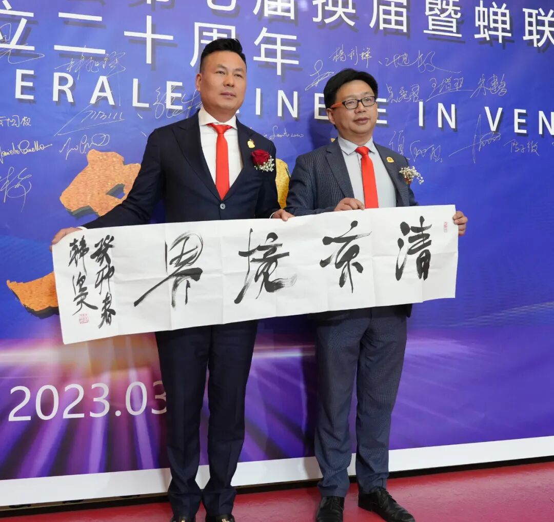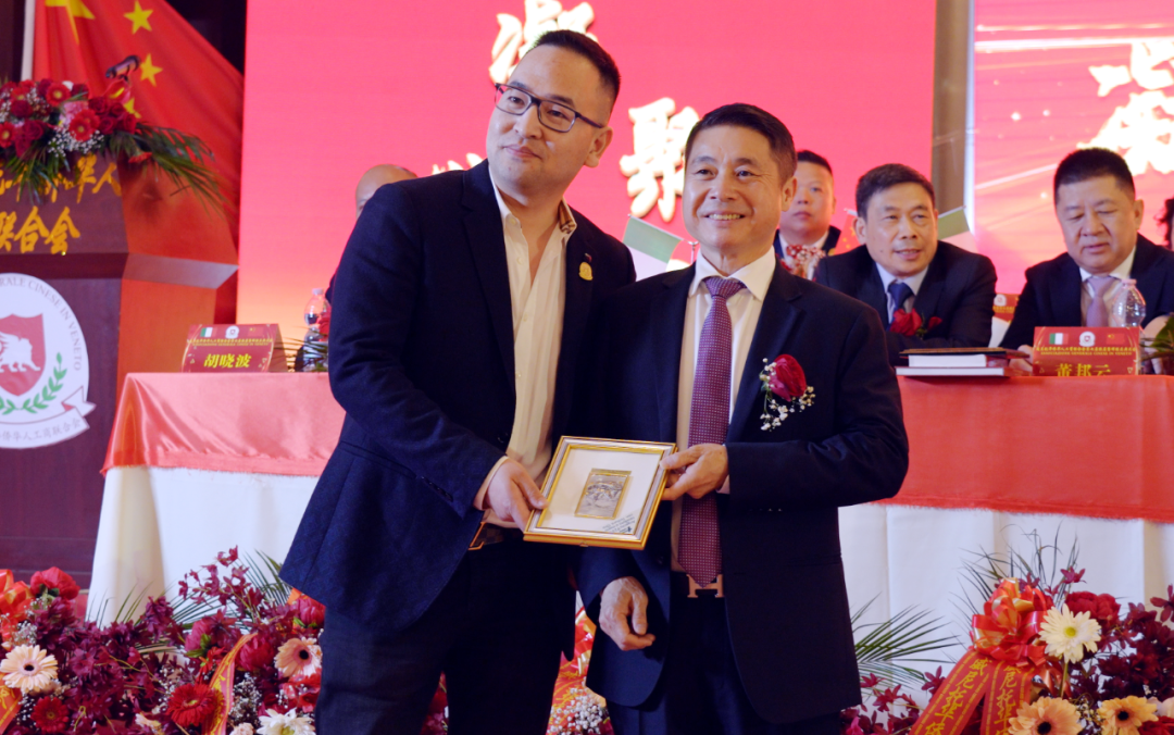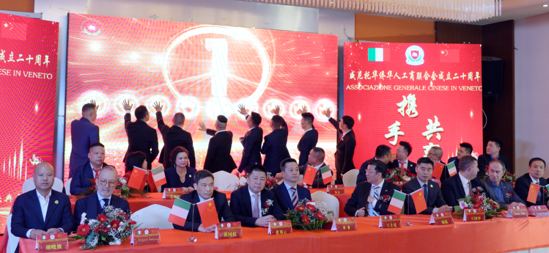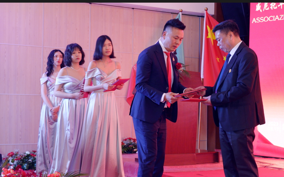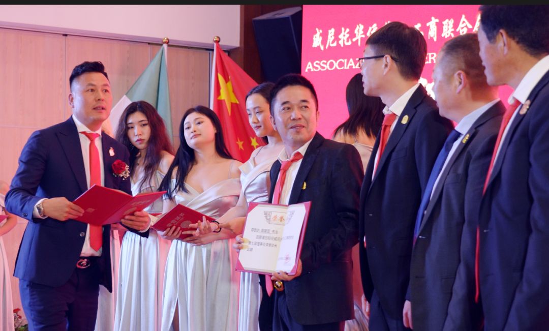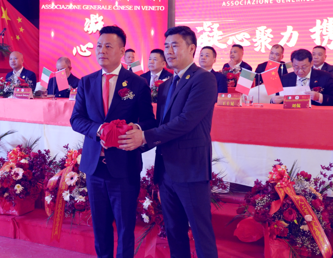 在全场热烈的掌声中,联合会创始人、永远名誉会长王国华、蝉联会长王士晃共同展示了会印、会旗,象征着威尼托华侨华人工商联合会成功进行换届,也标志着联合会承前启后、继往开来的新时代扬帆起航!
