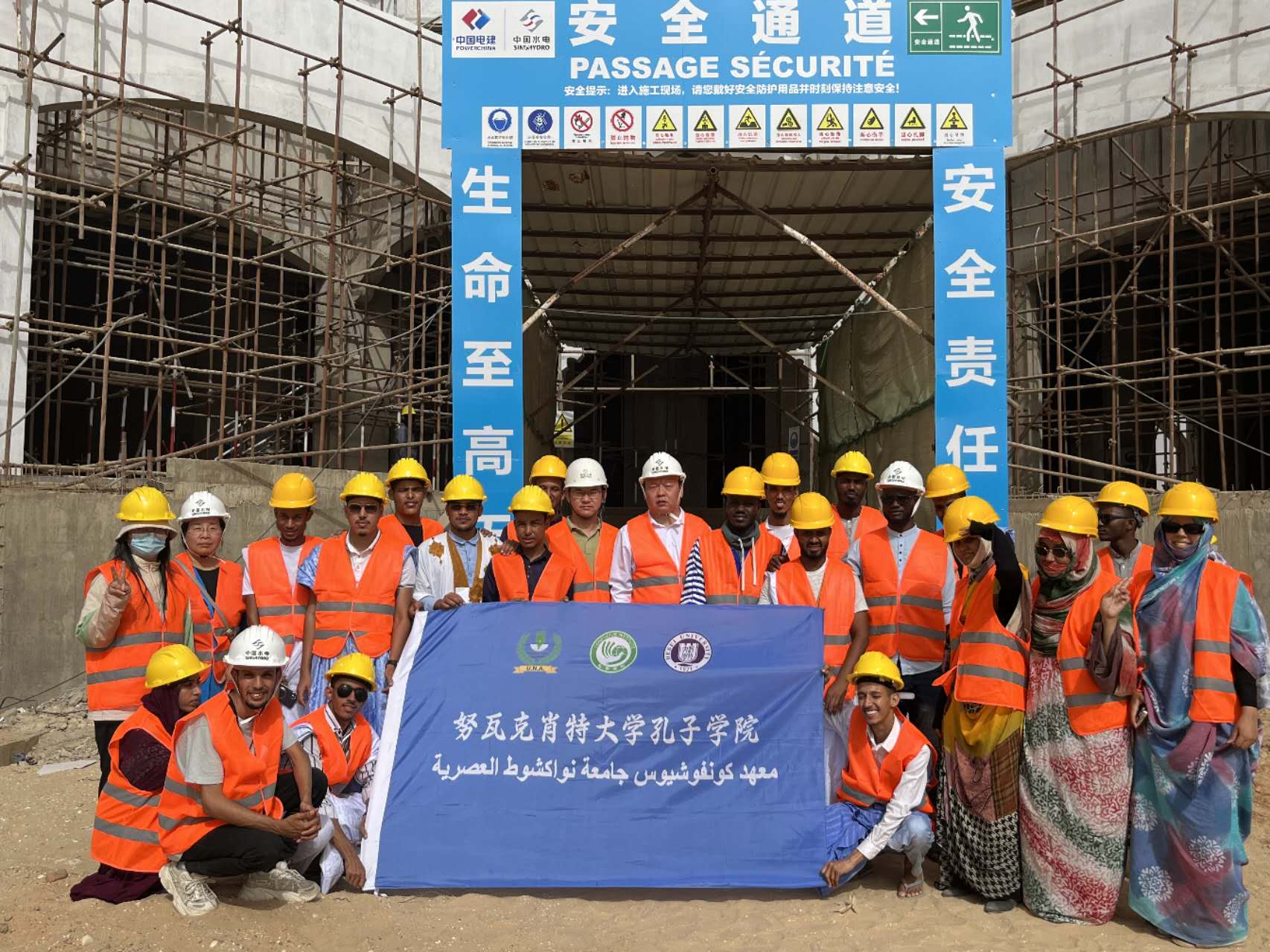 讲座后,孔院组织奖学金生参观了由“中国路桥”主持的援毛塔努瓦克肖特立交桥项目的驻地和施工现场,以及“中国电建·中国水电”主持的五星级酒店施工现场。同学们对中国建设的高水平和高要求有了直观体会,对专业汉语有了直接感受。
