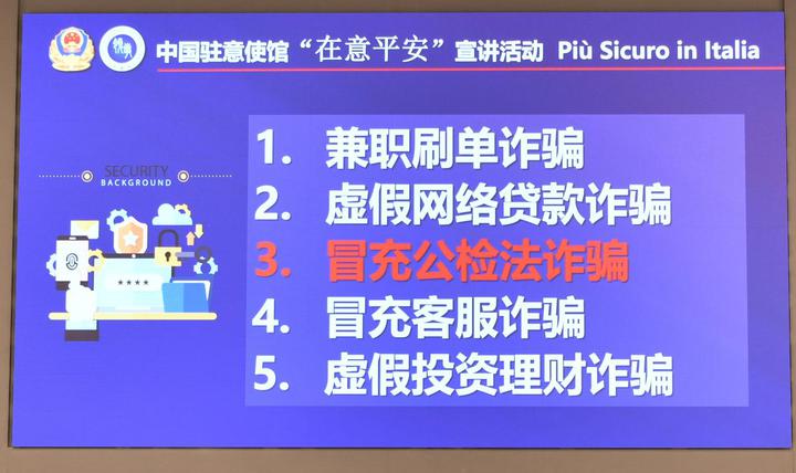 中国驻意大利使馆警务联络官张振贵参赞在活动上播放了大量视频资料,用更直接感觉帮助侨胞更清楚地了解电信诈骗的手法。视频中显示,诈骗分子利用假冒的身份和各种技术手段,通过电话、短信和电子邮件等途径进行诈骗。他们以各种借口诱使人们透露个人信息,如银行账户、密码和身份证号码。同时,他们还使用恐吓、威胁和利诱等心理战术,让受害者上当受骗。这些视频资料提醒侨胞们要警惕陌生电话和不明来源的信息,不轻易相信陌生人,并保护好个人的敏感信息(身份和银行卡),遇到可疑情况或电信诈骗骚扰,要及时向警方报警(中国公安反诈热线96110)或向使领馆寻求协助。