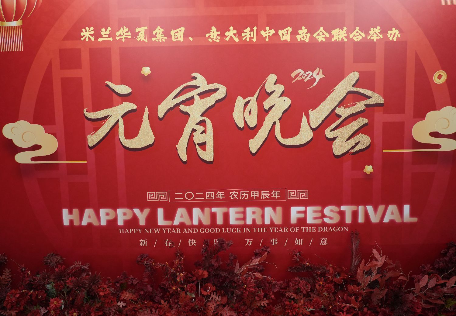 当晚,米兰168大酒店被装点得格外喜庆,彩灯高挂,花团锦簇,处处洋溢着节日的欢乐气氛。中国驻米兰总领事馆商务参赞耿协威、阿斯蒂省长兼市长Maurizio Rasero和意大利中国商会会员单位负责人、意大利工商界人士、米兰华夏集团员工等中意嘉宾200多人欢聚一堂,共同迎接这场文化的盛宴----不仅是元宵佳节的欢庆活动,更成为中意文化交流与友谊的生动见证。