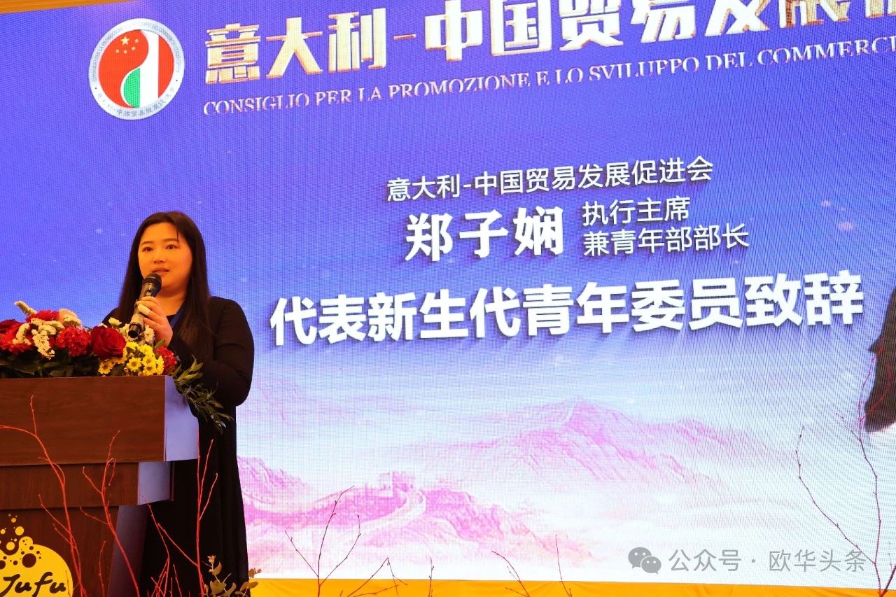 ▲意大利-中国贸易促进会执行主席兼青年部部长郑子娴代表新生代青年委员致辞。