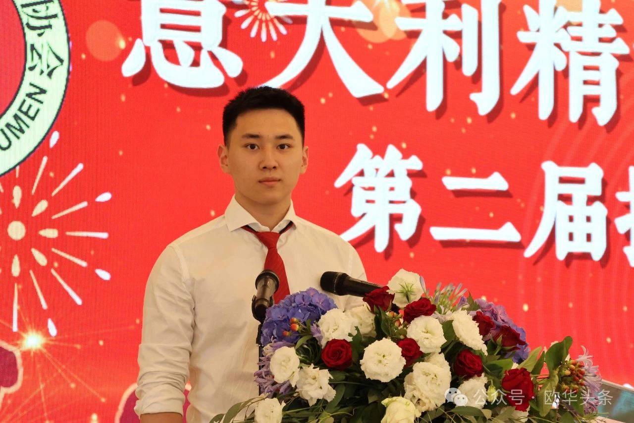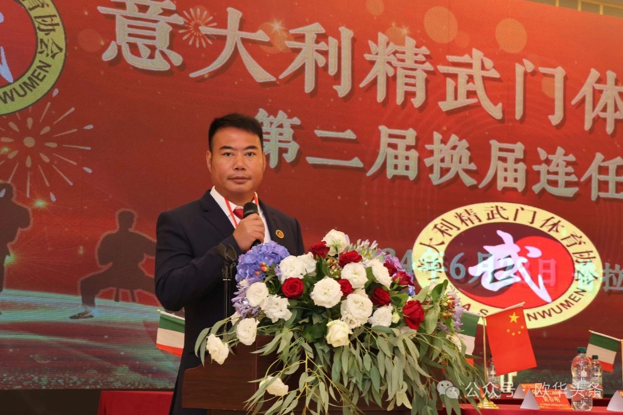 杨顺银会长代表意大利精武门体育协会的全体成员,对在百忙之中抽空出席此次换届典礼的所有领导和来宾表示最热烈的欢迎和最衷心的感谢,并向所有关心支持武术事业发展的社会各界人士致以崇高的敬意。他表示,承蒙大家的厚爱和支持,推荐连任第二届会长,他深感荣幸,同时也深感责任重大。首先,中国武术是中国文化的重要组成部分,拥有悠久的历史,中华武术传承下来的不仅仅是武艺,也传承了代表中国人的精神内涵。为了发扬中华武术,他在2010年考取了意大利国家体育局颁发的散打六段教练证书。2011年,他在意大利普拉托开设了合气道馆,并正式向社会教学。2016年,他获得了意大利国家武术协会颁发的“武术散打教练证和段位证书”。2018年10月,在意大利成立了“精武门”体育协会。目前,佛罗伦萨和普拉托已设立了两家散打会馆。他一直希望通过武术的交流,不仅能强身健体,还能促进中意两国的文化交流,加深两国人民的友谊。