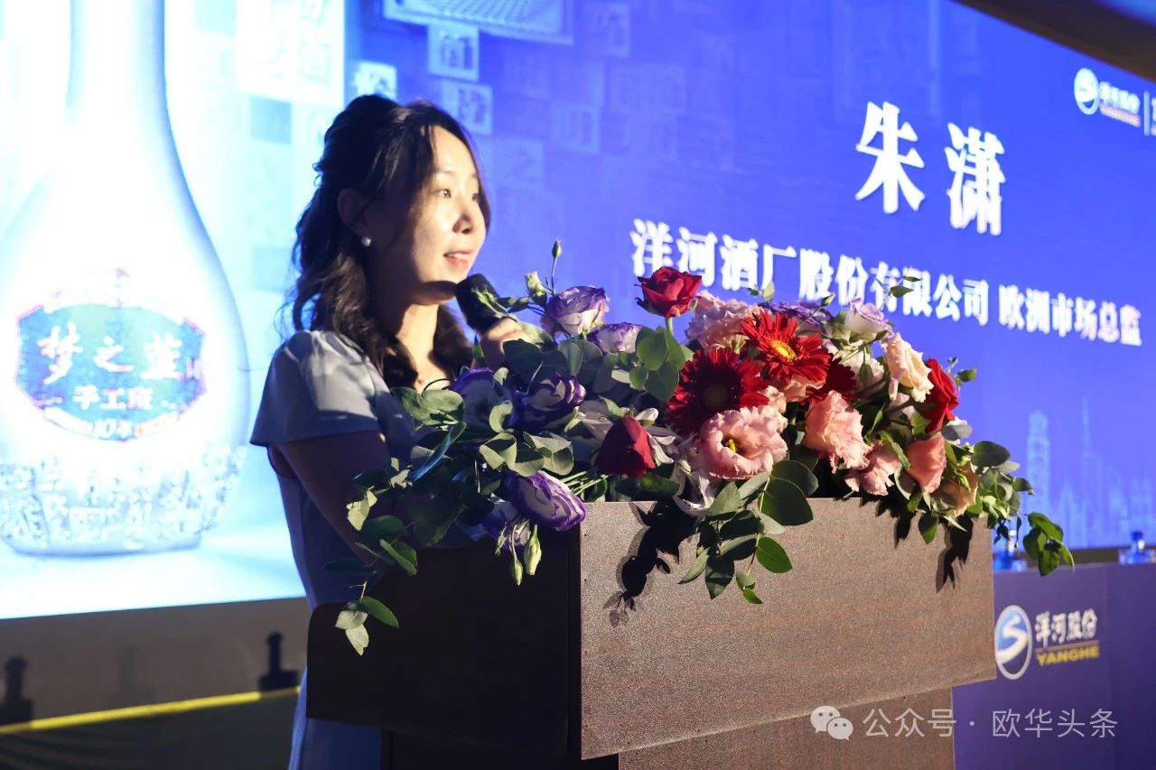 随后,江苏洋河酒厂股份有限公司欧洲市场总监朱潇发表讲话,她详细介绍了梦之蓝手工班的历史背景与酿造工艺。她指出,梦之蓝手工班由酿酒经验超过20年的老匠人全流程手工酿造,代表了中国白酒行业的顶级水准。