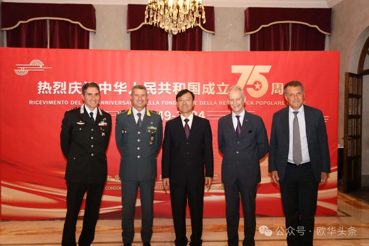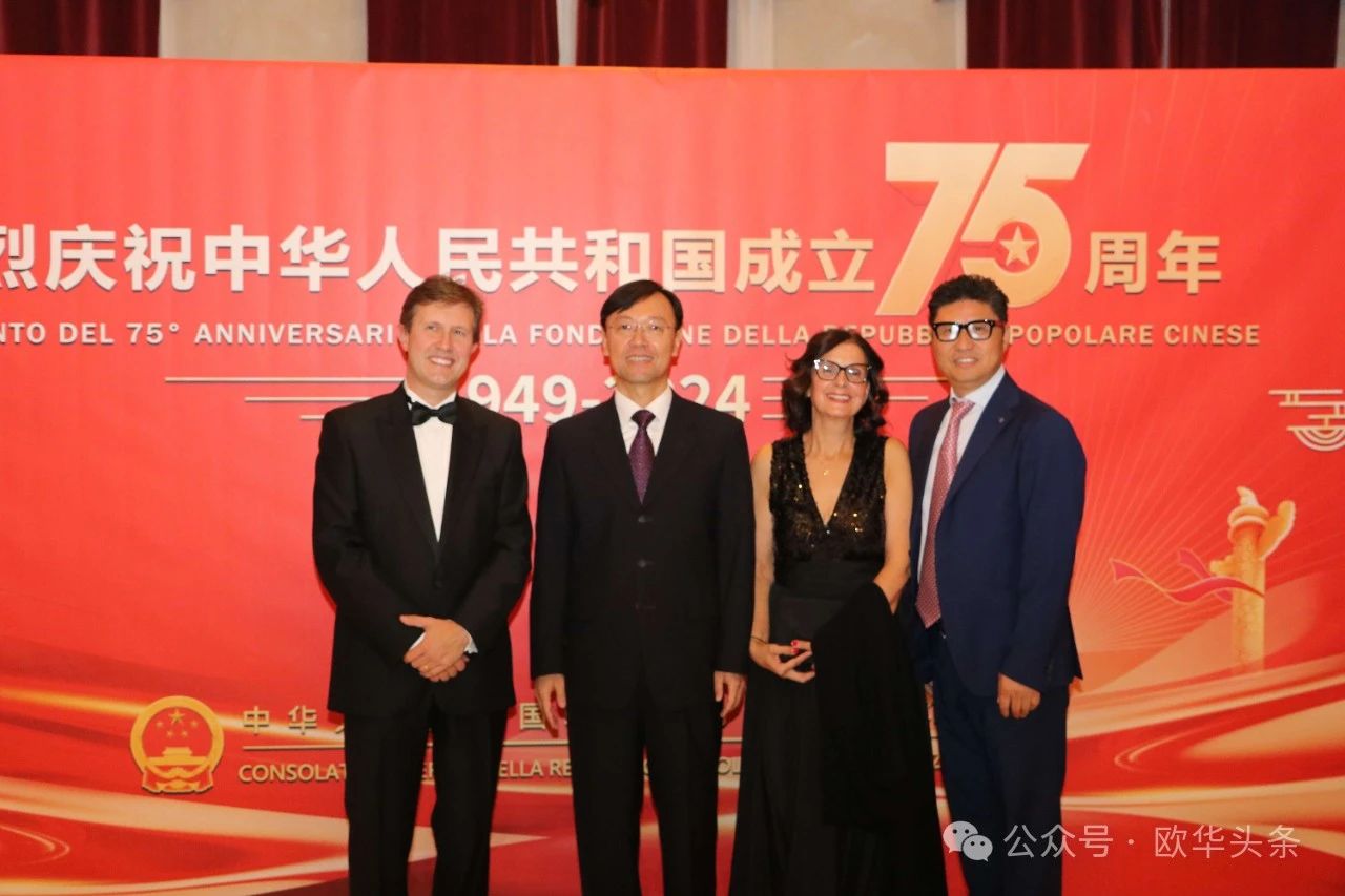 (陈静)2024年9月26日晚,中国驻佛罗伦萨总领事馆在佛罗伦萨瑞吉酒店隆重举办庆祝中华人民共和国成立75周年招待会。欧洲议会议员纳尔代拉先生、普拉托市市长布杰迪女士、佛罗伦萨市政府代表维奇尼先生、佛罗伦萨副省督梅塞蕾女士、普拉托副省督阿兰奇奥先生、佛罗伦萨市议会主席古奇奥内先生、佛罗伦萨法院院长丽佐女士、普拉托省省长卡拉马伊先生、普拉托市议会主席提纳义先生、佛罗伦萨警察局长奥列玛先生、佛罗伦萨宪兵司令德·西蒙内先生、佛罗伦萨财政警察司令萨尔萨诺先生、佛罗伦萨大学校长佩特鲁奇女士、佛罗伦萨音乐学院院长普恰尔玛蒂先生、美国驻佛罗伦萨总领事,巴拉德女士、法国驻佛罗伦萨总领事卢松先生等来自意大利政界、商界等各界代表200余人齐聚一堂,共同庆祝这一重要时刻。