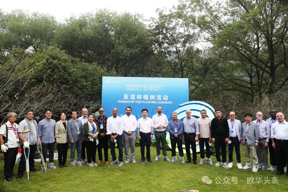 植树活动结束后,现场的嘉宾们纷纷合影留念,记录下这一历史性的时刻。金曙彬与其他城市的代表共同为树苗浇水,寓意着各国各市共同维护世界和平、绿色发展的愿望。