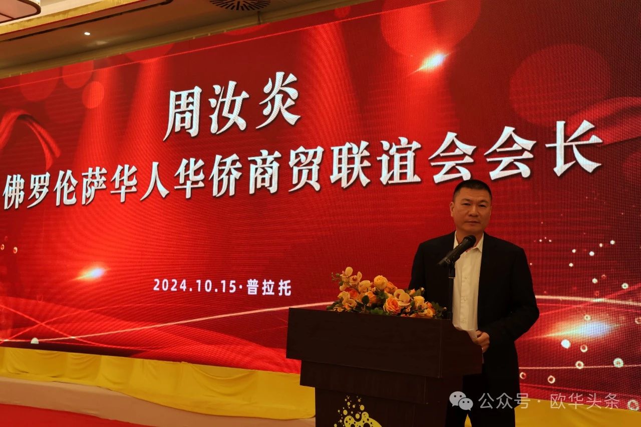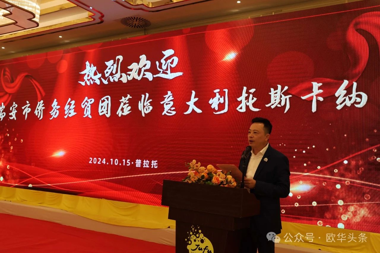 ▲意大利佛罗伦萨华人华侨商贸联谊会会长周汝炎致辞。他首先简要介绍了佛罗伦萨的基本情况,包括这座历史文化名城的丰富遗产和多样化的商业环境。周汝炎会长提到,佛罗伦萨不仅是意大利的艺术之都,也是一个充满商机的经济中心。他希望通过此次瑞安市侨务经贸团的到访,能够进一步加强佛罗伦萨市与瑞安市之间的经济合作与文化交流。他表示,佛罗伦萨华人华侨商贸联谊会将积极发挥桥梁作用,促进双方在贸易、投资及人文交流等方面的合作,共同开创美好的未来。