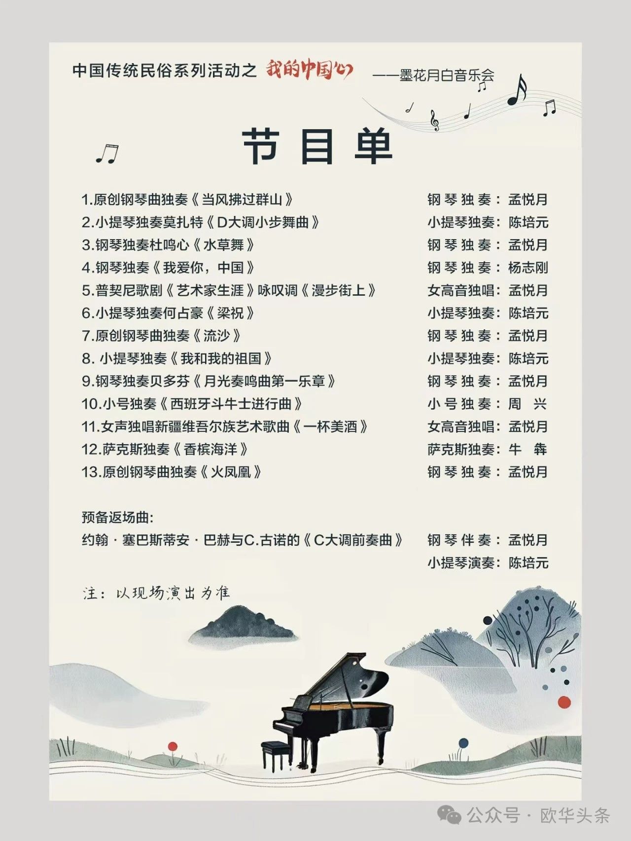 演出嘉宾阵容包括著名旅意音乐人孟悦月、中国青年小提琴演奏家陈培元、洛阳市管乐协会会长周兴、著名音乐策划人杨志刚,以及青年萨克斯演奏家牛犇。音乐会时长为1小时30分,节目涵盖了中国传统音乐、西方经典作品,以及孟悦月的多首原创钢琴曲。整场演出以孟悦月的原创钢琴曲《当风拂过群山》开场,并在她的作品《火凤凰》中落幕。其间还穿插了她的女高音独唱与古典钢琴曲独奏,以及小提琴、小号、萨克斯等多种表演形式,为观众带来了一场多元化的艺术体验。在音乐会的最后,孟悦月与陈培元特意返场,为大家加演了巴赫与古诺的《C大调前奏曲》,让整场音乐会在观众们的热烈掌声中圆满落幕。