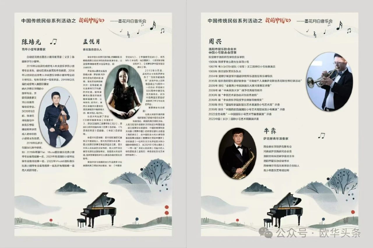 2024年11月7日下午15点,由洛阳民俗博物馆主办,天行健集团股份有限公司和意大利“玫瑰世纪”音乐工作室共同策划的中国传统民俗系列活动之《我的中国心》墨花月白音乐会在洛阳市老子纪念馆成功举办。意大利当地时间为上午8点,中意两地线上线下的观众共同欣赏了这场跨国音乐盛宴。