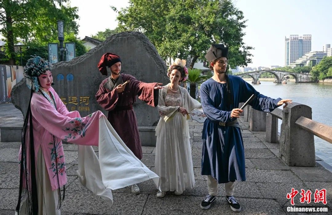 2024年6月15日,千年运河千里行“新马可·波罗”游记活动在中国大运河南端浙江杭州举行,由活动征集的意大利友人作为“新马可·波罗”,游览杭州。图为外籍友人在大运河边学戏曲。中新社记者王刚摄