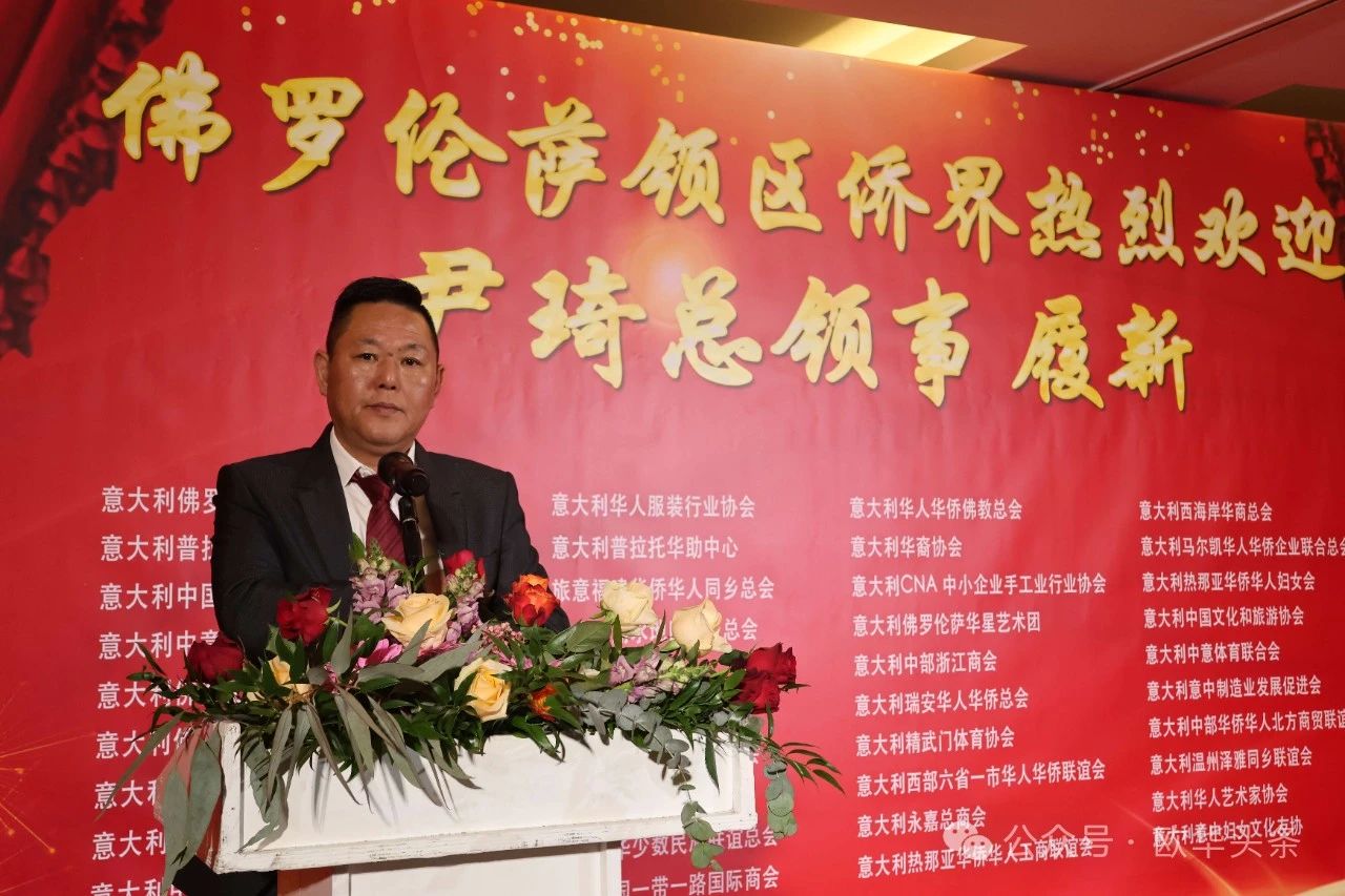 黄晓龙会长在致辞中表达了对尹琦总领事到来的热烈欢迎和由衷敬意。他将尹总领事的到任比喻为“破晓的曙光”,为广大侨胞带来了新的希望与动力,并相信在尹总领事的英明领导下,驻佛罗伦萨总领馆将为侨胞提供更加卓越、周到的服务,为侨界的发展提供坚实后盾。同时,他期待尹总领事能够进一步推动中意两国在经济、文化、教育等领域的深度合作,助力两国友好关系迈向更高峰。
