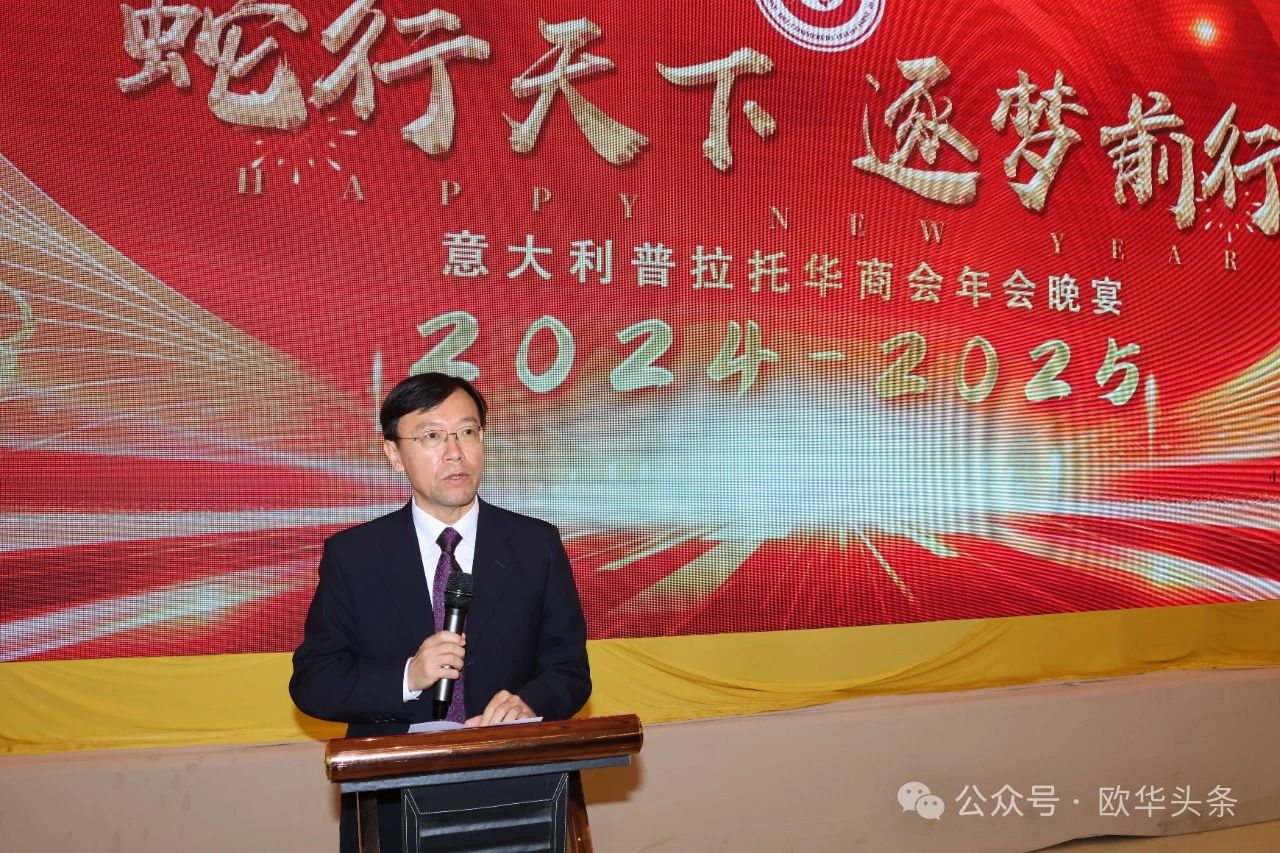 管仲奇副总领事在讲话中指出,中意友谊正不断深化,各领域合作日益紧密,并在人文交流等多领域展现出新的亮点,为培育更多新时代的“马可波罗”提供了广阔平台。他勉励侨胞们在新形势下找到自身发展的定位,紧抓中意深化合作的宝贵机遇,推动事业迈上新台阶,同时积极为中意两国友好关系贡献力量。最后,他向在场嘉宾送上新年祝福,祝愿大家事业蒸蒸日上,万事如意。