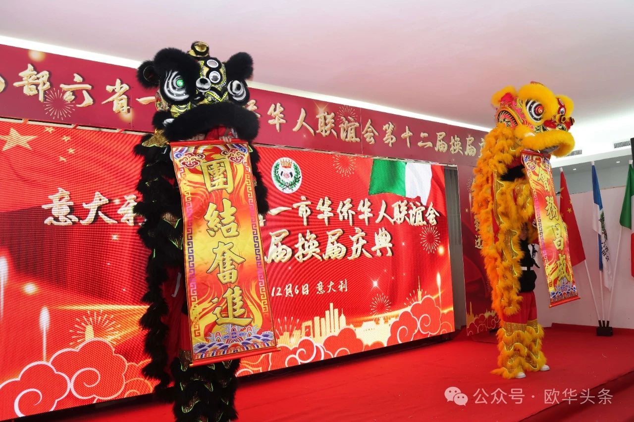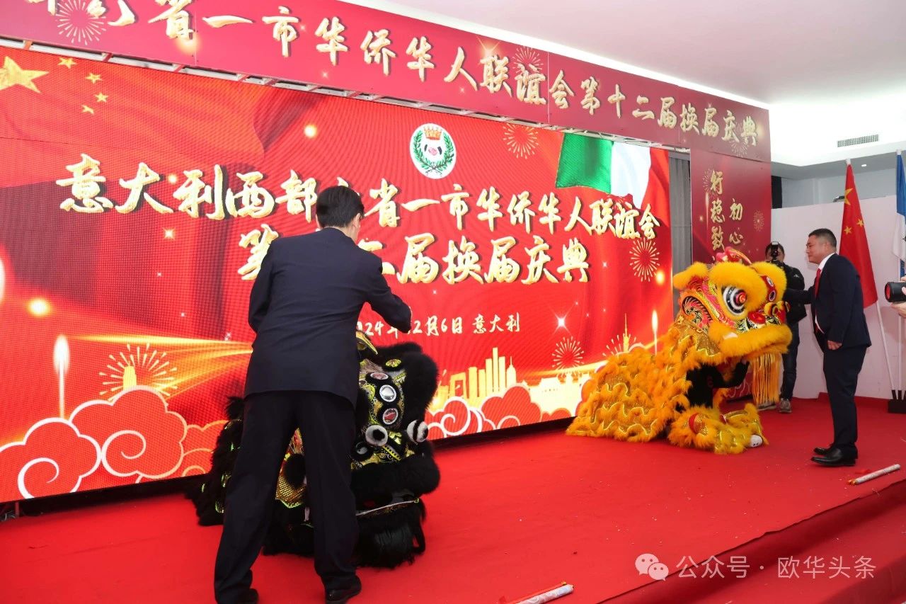 随后,由舞狮队伍带来的传统中国舞狮表演将庆典推向高潮。舞狮队伍一登场,鼓声震天,气势磅礴,引发全场热烈掌声。中国驻佛罗伦萨总领馆副总领事管仲奇先生与新任会长吴永忠先生共同上台,为舞狮“点睛”。不仅彰显了庆典的喜庆氛围,更表达了对联谊会新一届领导班子迈向新高峰的美好祝愿。这一环节将中意文化的交融与传承表现得淋漓尽致,为整场活动增色不少。