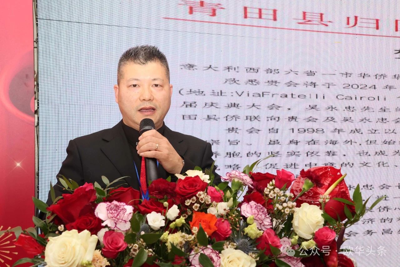吴永忠会长感谢所有莅临现场的嘉宾,表示非常荣幸能够获得大家的信任,荣任新一任会长。他特别向历任会长表达崇高敬意,感谢他们为联谊会的辛勤努力与无私奉献,同时对国内外涉侨部门、佛罗伦萨总领馆以及兄弟侨团的长期支持和悉心指导表示感谢,称他们是联谊会成长的重要支持力量。他还感谢了所有会员和家属的默默付出,吴永忠会长表示,正是他们的信任和支持,才让自己有勇气担负起这一责任。
