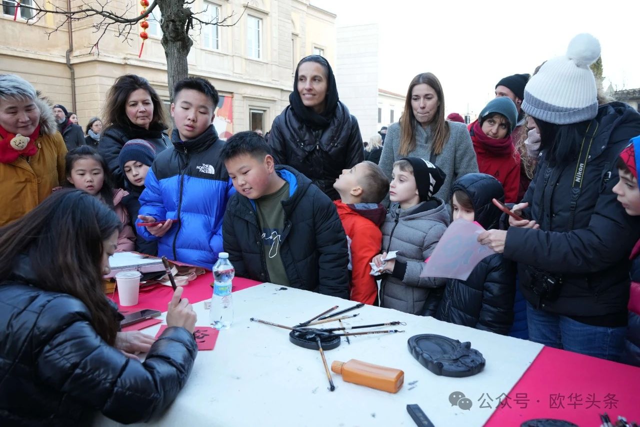 不仅如此,活动现场还特别设置了写毛笔字等中华传统文化体验区,让当地民众亲身感受中华文化的独特魅力。许多意大利友人跃跃欲试,在红纸上书写“福”字,感受新春祈福的美好寓意。