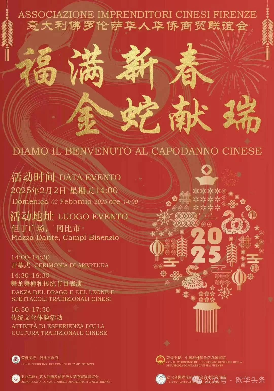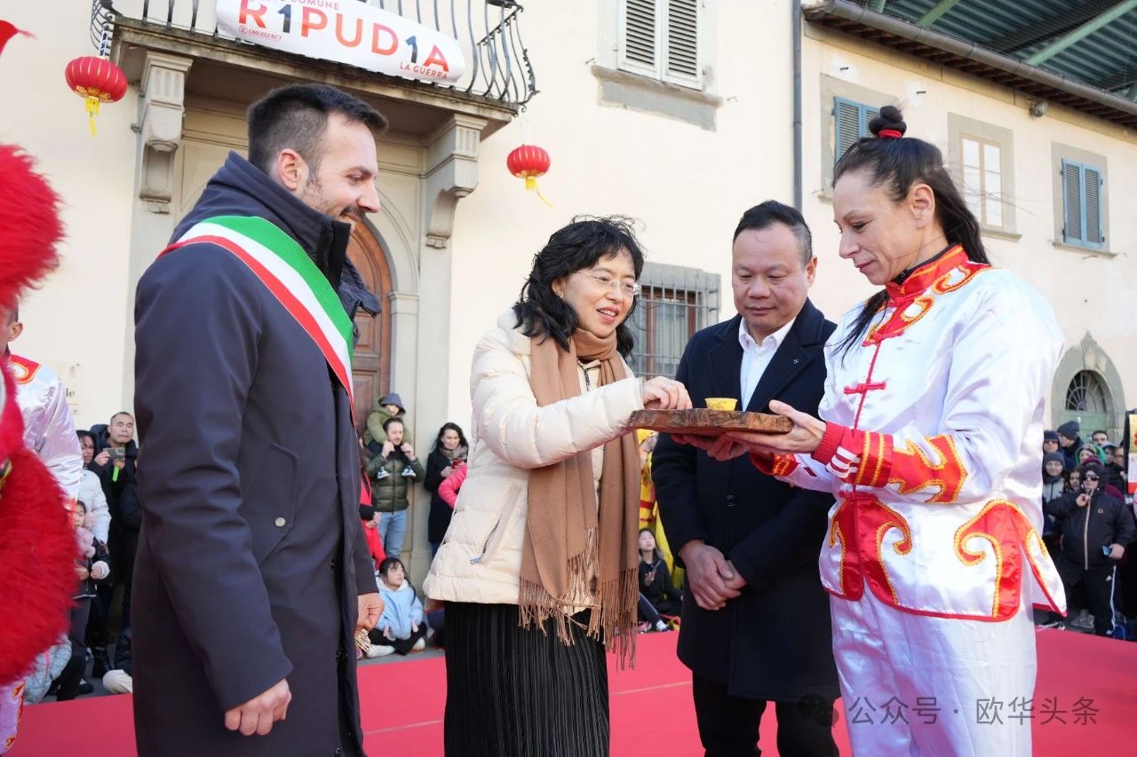 (陈静)2025年2月2日下午,首届“福满新春 金蛇献瑞”庆祝活动在意大利冈比市但丁广场隆重举行。此次活动由冈比市政府和中国驻佛罗伦萨总领事馆荣誉支持,由意大利佛罗伦萨华人华侨商贸联谊会、育才语言学校主办。当地中意居民、华人华侨及各界友好人士齐聚一堂,共同迎接乙巳蛇年的到来。