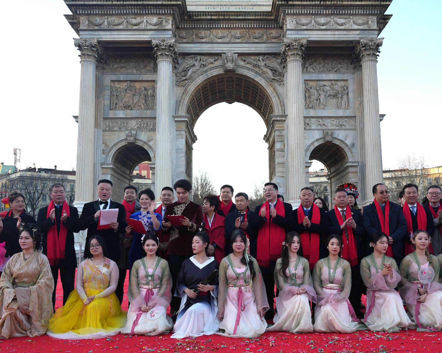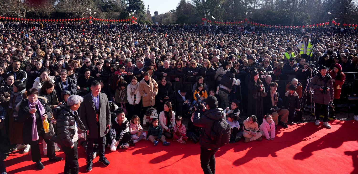 广场上鼓乐喧天,热闹非凡,吸引了众多人士参与。中国驻米兰总领事刘侃、付总领事张凯斌,意大利共和国总理府副秘书长阿莱桑德罗、米兰市副市长安娜、米兰大都会副市长弗朗哥、伦巴蒂大区议员尼克拉、米兰一区区长马蒂亚、米兰八区区长茱莉亚、塞斯托圣乔万尼市长罗伯特、意中友协主席玛利亚罗萨,米兰各侨团侨领与会员、华侨华人、米兰当地民众及游客逾五万人齐聚于此,共同欢庆中国的春节、世界的春节。