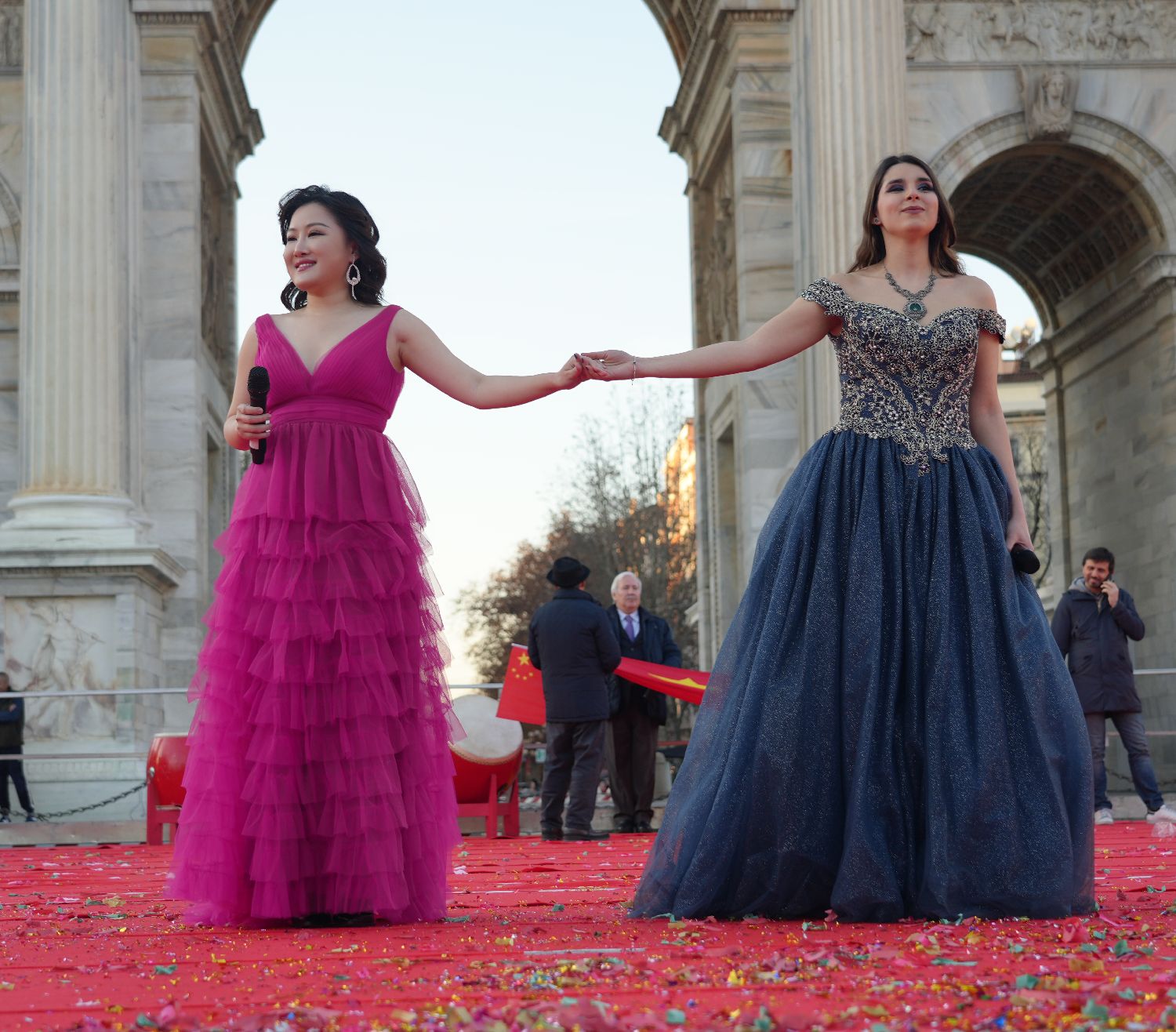 当然,本次大联欢的内容远不止舞龙舞狮。特别策划的文艺演出丰富多样,内容精彩。瑞福铜鼓敲响,沉稳而富有节奏感的鼓点仿佛在诉说着古老的故事;舞蹈演员们身姿轻盈,用灵动的舞姿展现着青春的活力;歌手们歌声悠扬,一首首动听的歌曲回荡在广场上空;传统越剧戏曲婉转细腻,展现出中华戏曲文化的独特韵味;功夫扇表演刚柔并济,扇动之间尽显中国武术的魅力;儿童们天真可爱的节目为现场增添了纯真的欢乐氛围;变脸表演神秘莫测,引得观众阵阵惊叹;民族歌曲唱出了各民族的风情。其中中意男女歌手合唱《茉莉花》《我的太阳》这一环节尤为引人注目,两首歌曲悠扬的旋律交织在一起,体现了中意文化的和谐交融,让观众们深深陶醉其中,赢得了如潮般的掌声。