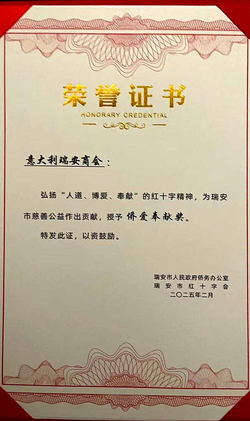 此次荣获瑞安市“侨爱奉献奖”,是对意大利瑞安商会长期以来为家乡发展所做贡献的充分肯定,也是对商会未来发展的鼓励和鞭策。