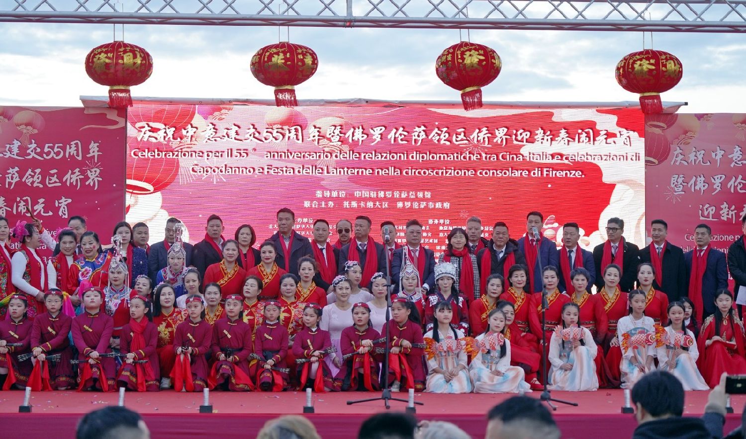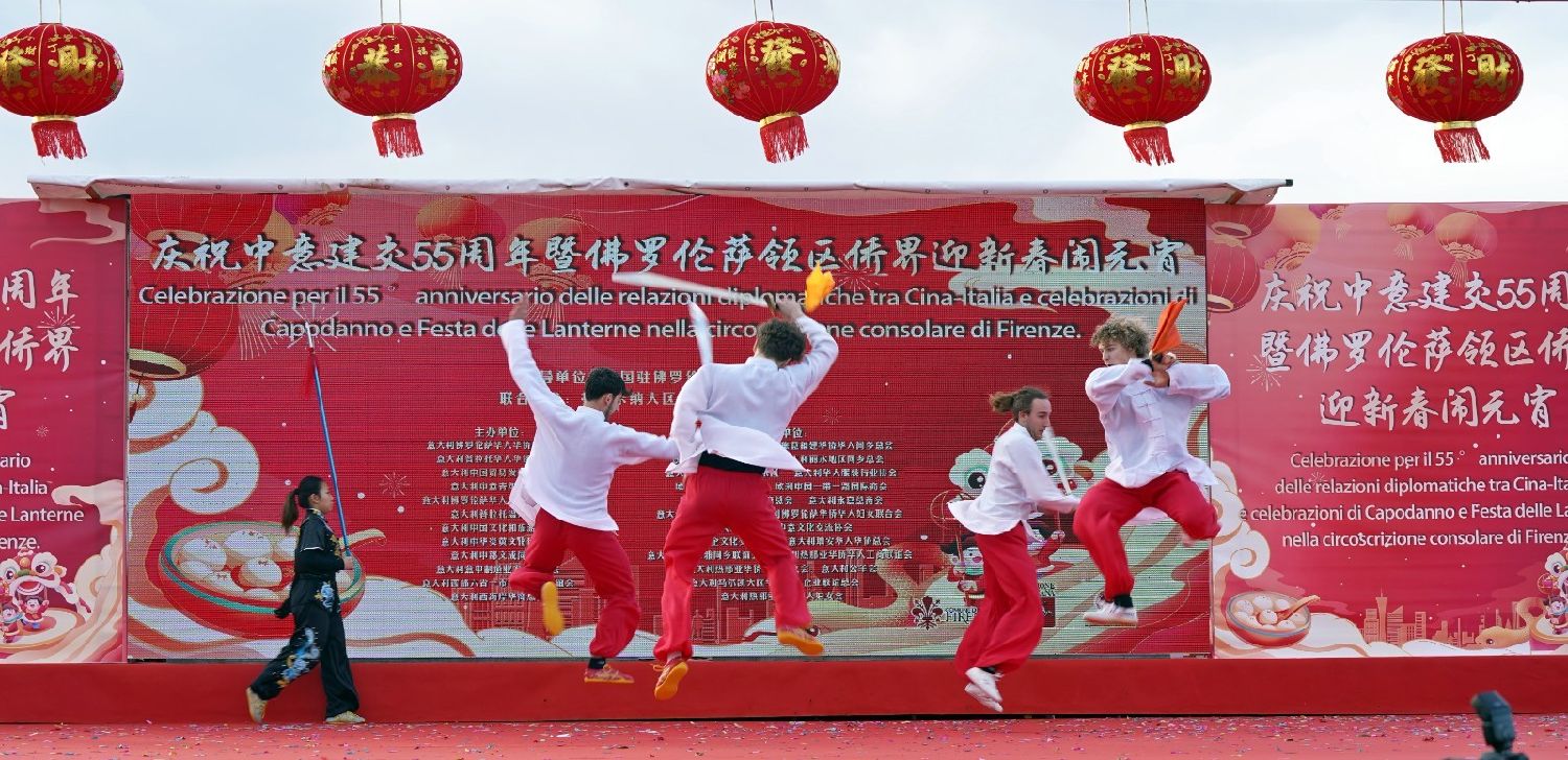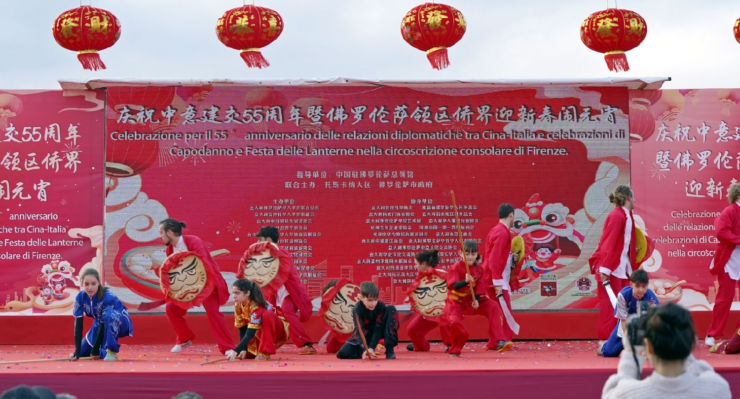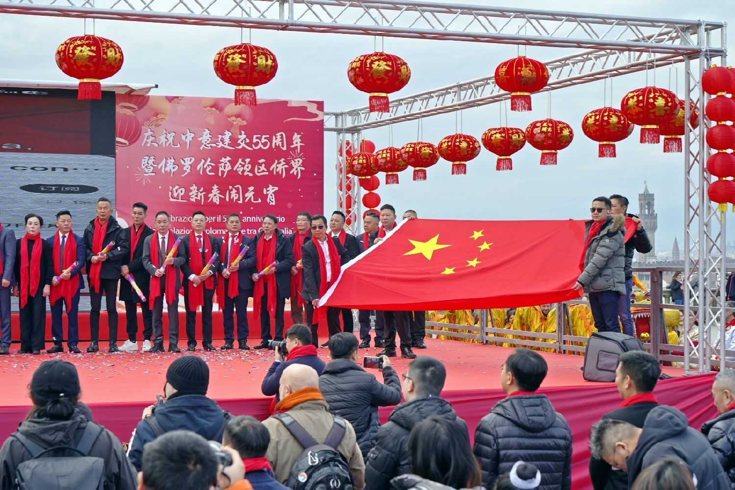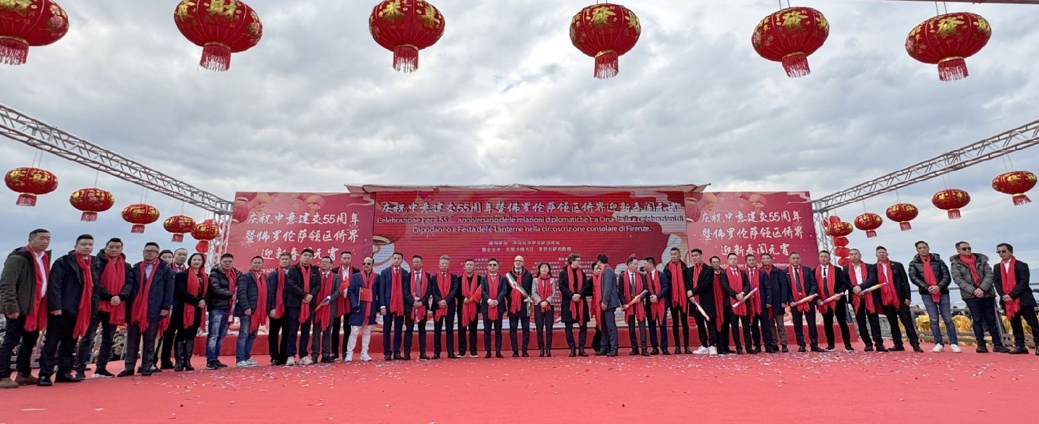 2月9日下午,意大利佛罗伦萨的米开朗基罗广场(Piazzale Michelangelo,华人俗称“皇帝山”)洋溢着浓厚的节日气氛,欢声雷动,热闹非凡。一场盛大的庆祝活动在此隆重上演,这不仅是佛罗伦萨领区侨界欢度新春、共闹元宵的年度盛典,更是纪念中意建交55周年的重要时刻。虽然活动当天上午一度下起了雨,但午后阳光终于普照,给广场增添了融融暖意。四处悬挂的红灯笼,寓意着喜庆与团圆,让现场沉浸在浓浓的节日氛围中。