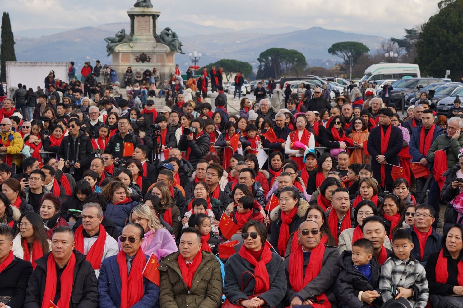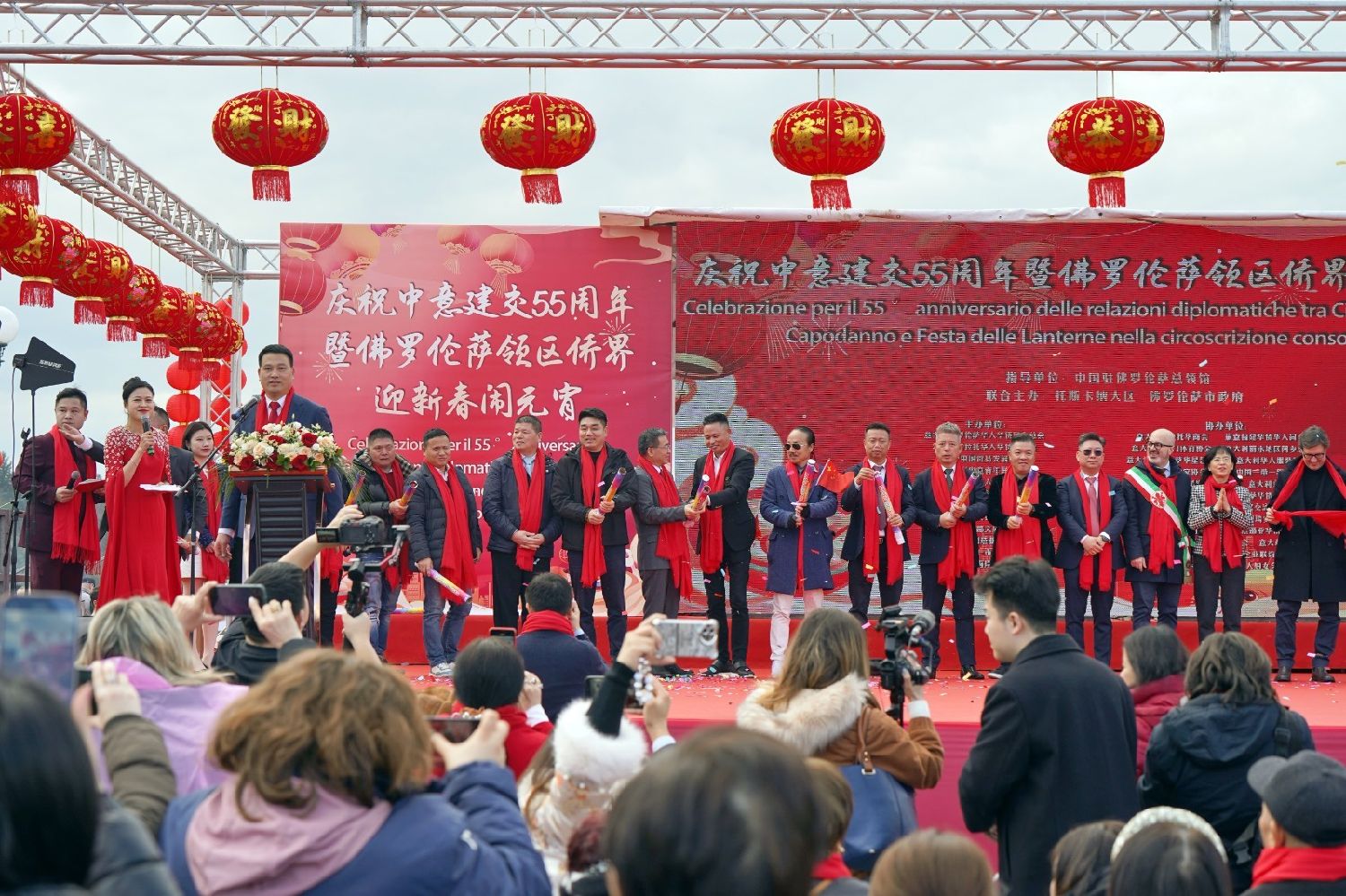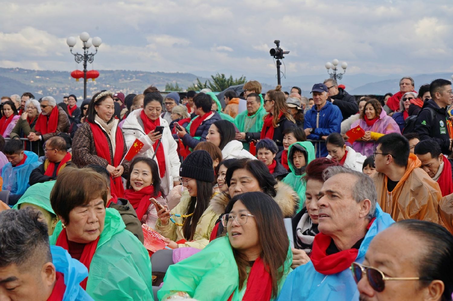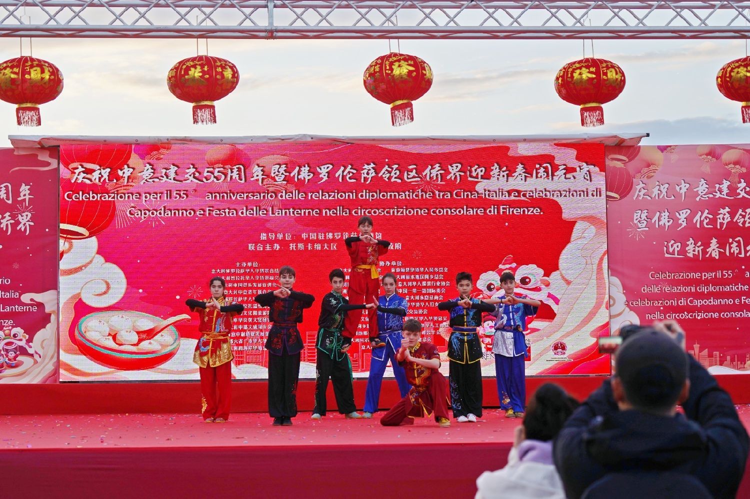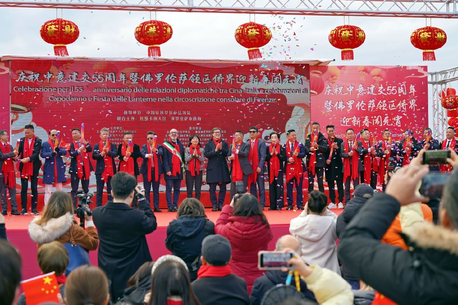 2月9日下午,意大利佛罗伦萨的米开朗基罗广场(Piazzale Michelangelo,华人俗称“皇帝山”)洋溢着浓厚的节日气氛,欢声雷动,热闹非凡。一场盛大的庆祝活动在此隆重上演,这不仅是佛罗伦萨领区侨界欢度新春、共闹元宵的年度盛典,更是纪念中意建交55周年的重要时刻。虽然活动当天上午一度下起了雨,但午后阳光终于普照,给广场增添了融融暖意。四处悬挂的红灯笼,寓意着喜庆与团圆,让现场沉浸在浓浓的节日氛围中。