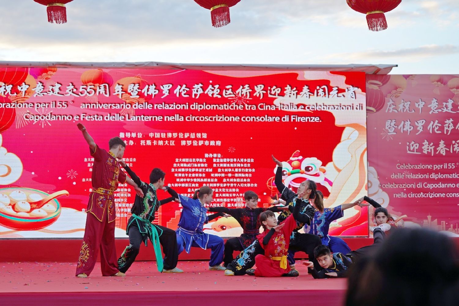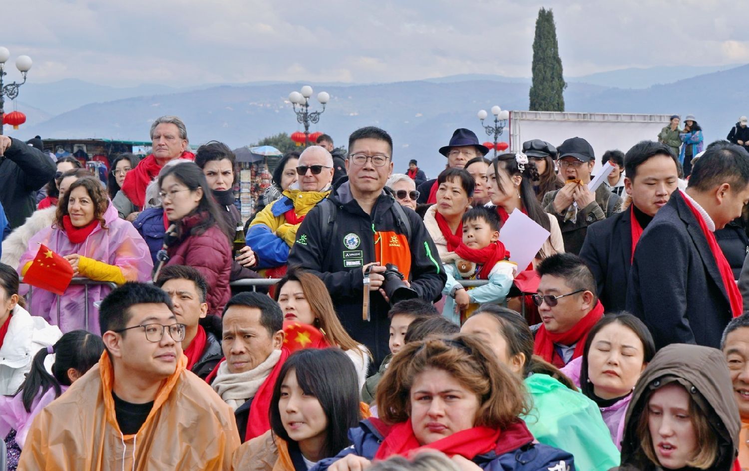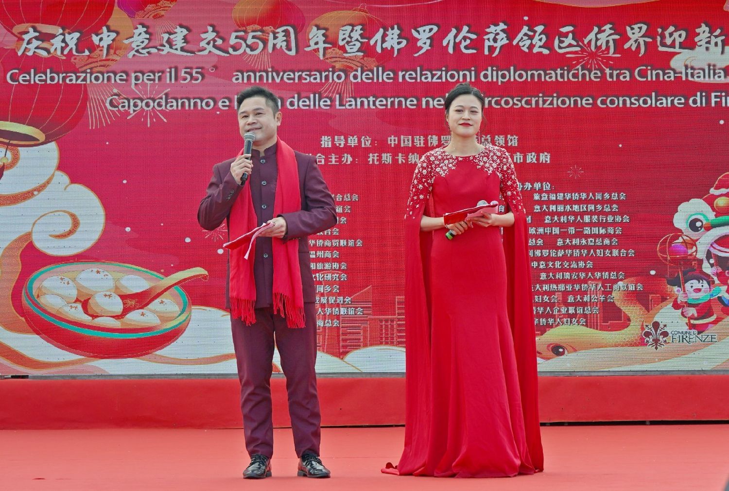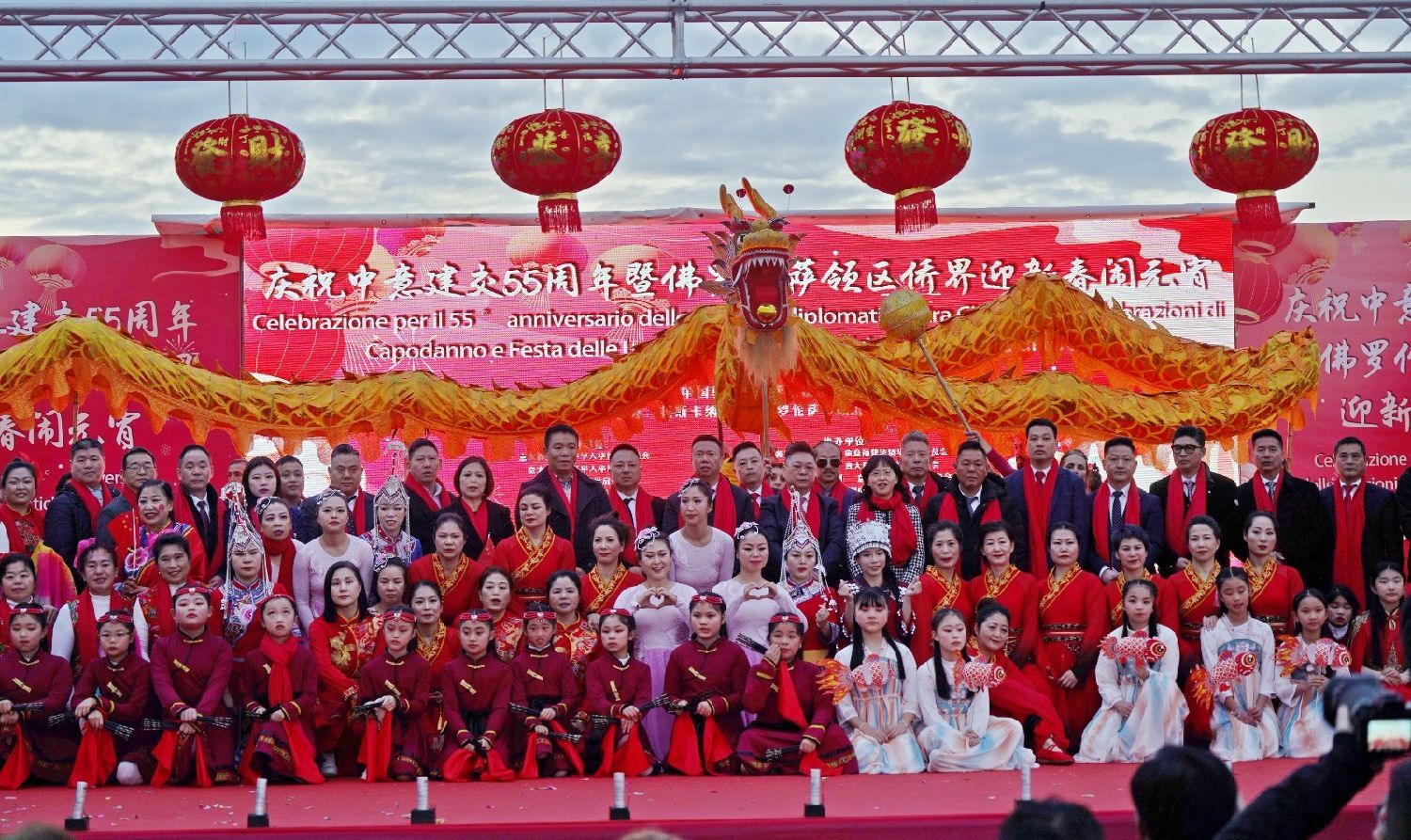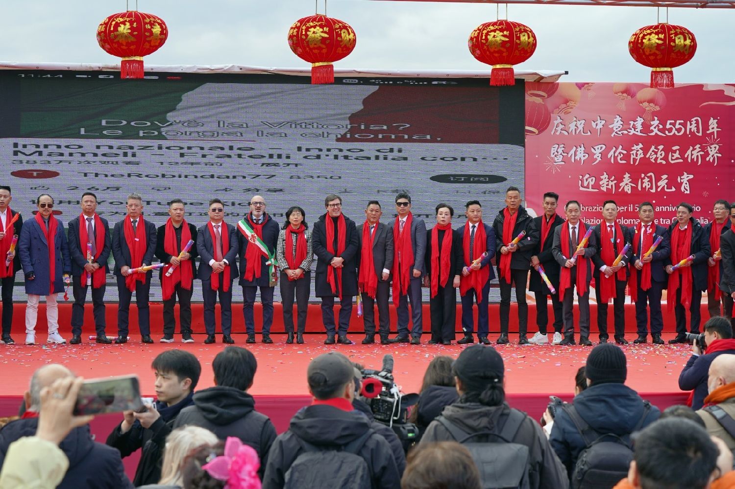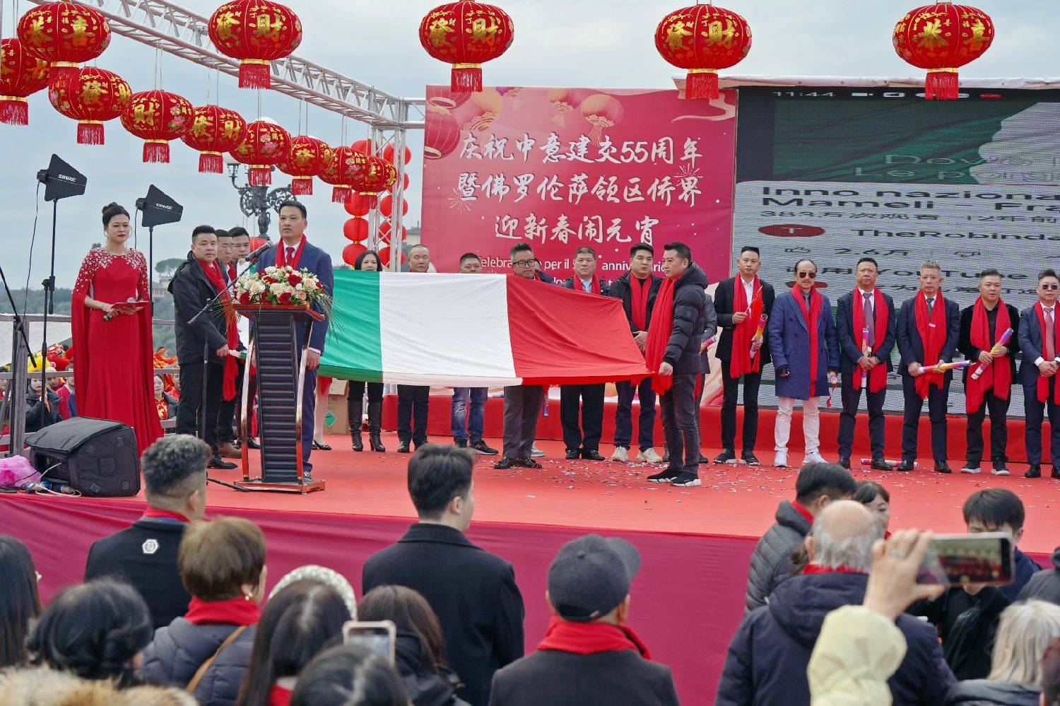 2月9日下午,意大利佛罗伦萨的米开朗基罗广场(Piazzale Michelangelo,华人俗称“皇帝山”)洋溢着浓厚的节日气氛,欢声雷动,热闹非凡。一场盛大的庆祝活动在此隆重上演,这不仅是佛罗伦萨领区侨界欢度新春、共闹元宵的年度盛典,更是纪念中意建交55周年的重要时刻。虽然活动当天上午一度下起了雨,但午后阳光终于普照,给广场增添了融融暖意。四处悬挂的红灯笼,寓意着喜庆与团圆,让现场沉浸在浓浓的节日氛围中。