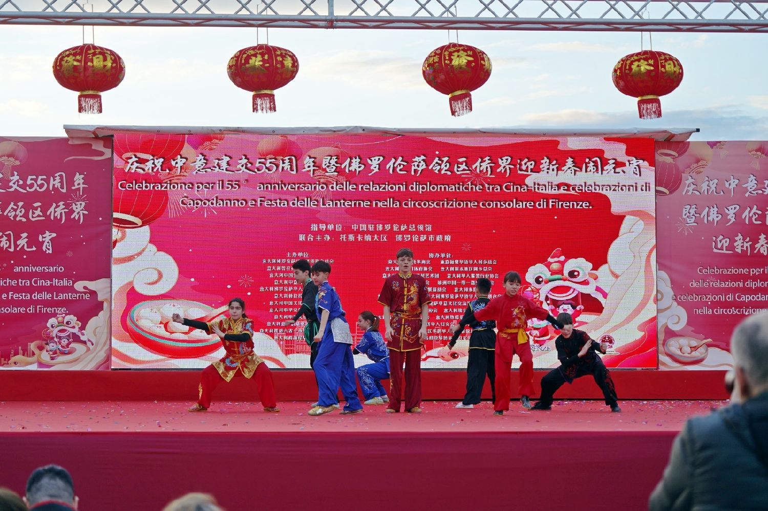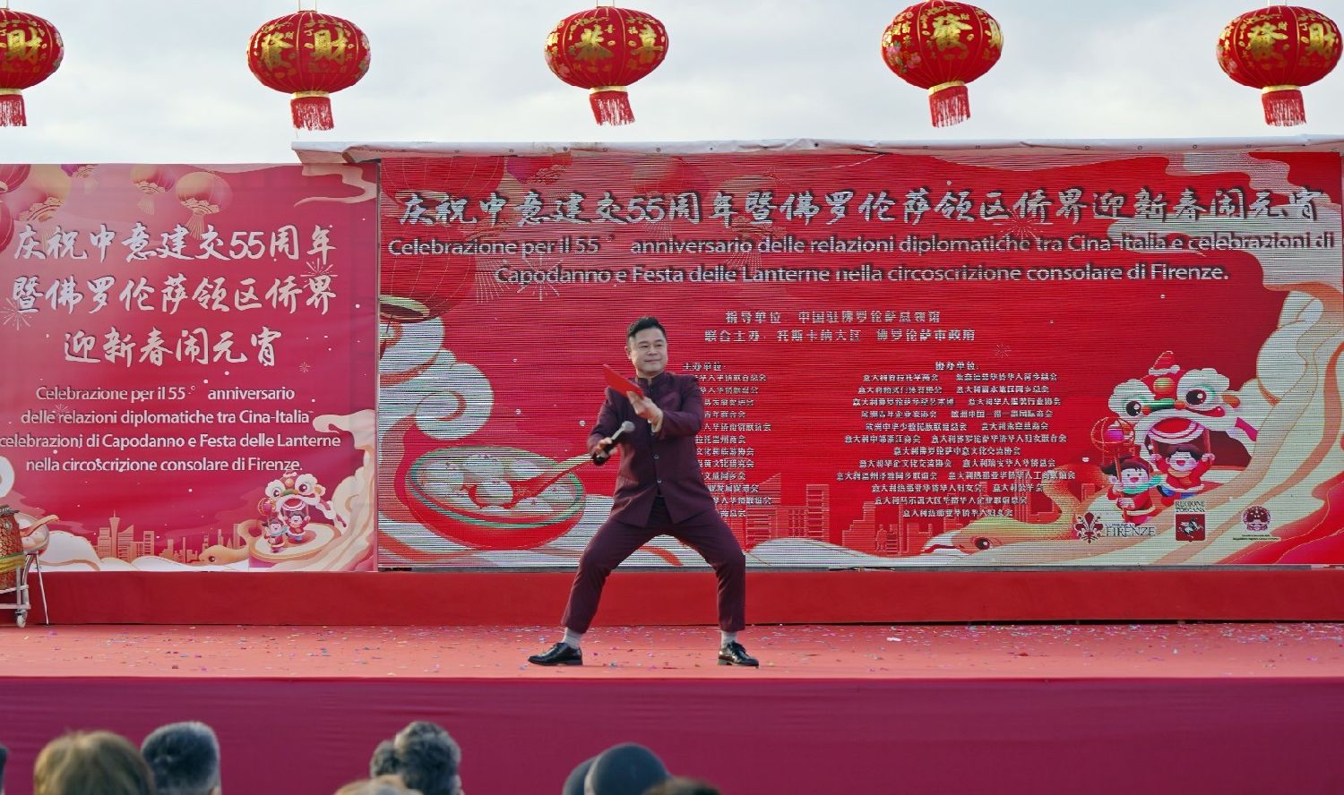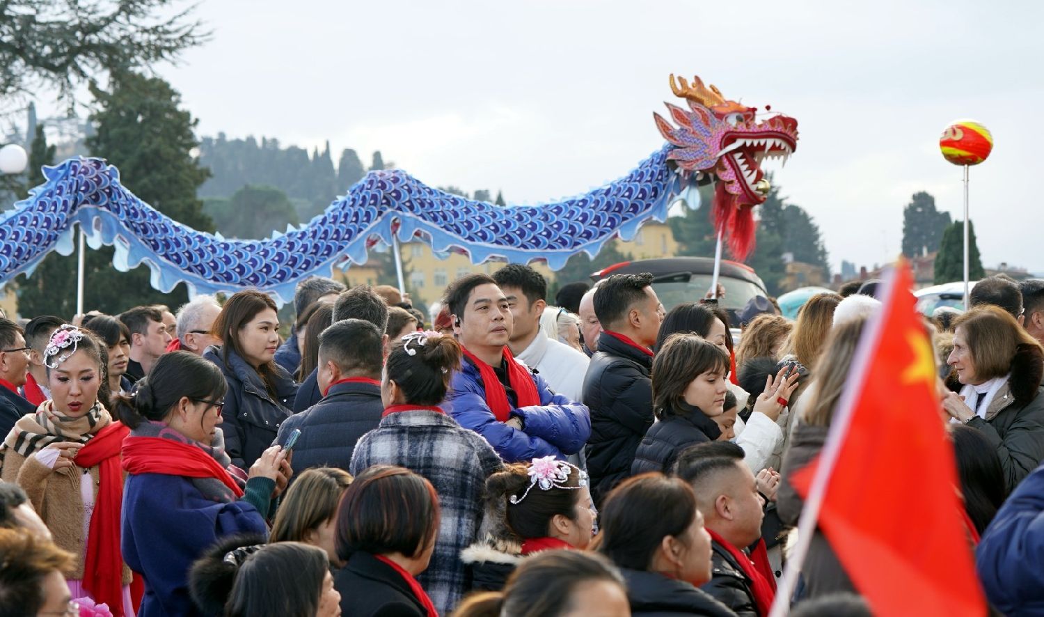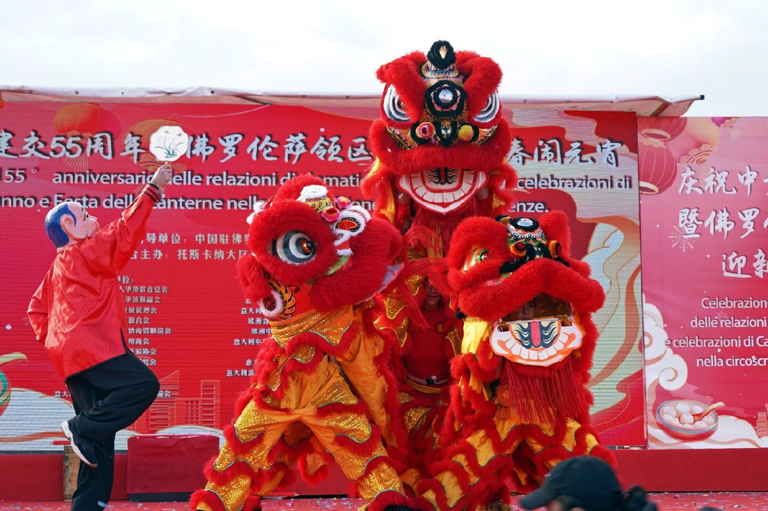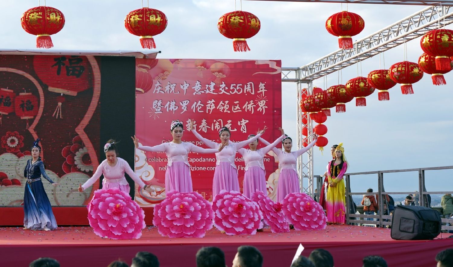 2月9日下午,意大利佛罗伦萨的米开朗基罗广场(Piazzale Michelangelo,华人俗称“皇帝山”)洋溢着浓厚的节日气氛,欢声雷动,热闹非凡。一场盛大的庆祝活动在此隆重上演,这不仅是佛罗伦萨领区侨界欢度新春、共闹元宵的年度盛典,更是纪念中意建交55周年的重要时刻。虽然活动当天上午一度下起了雨,但午后阳光终于普照,给广场增添了融融暖意。四处悬挂的红灯笼,寓意着喜庆与团圆,让现场沉浸在浓浓的节日氛围中。