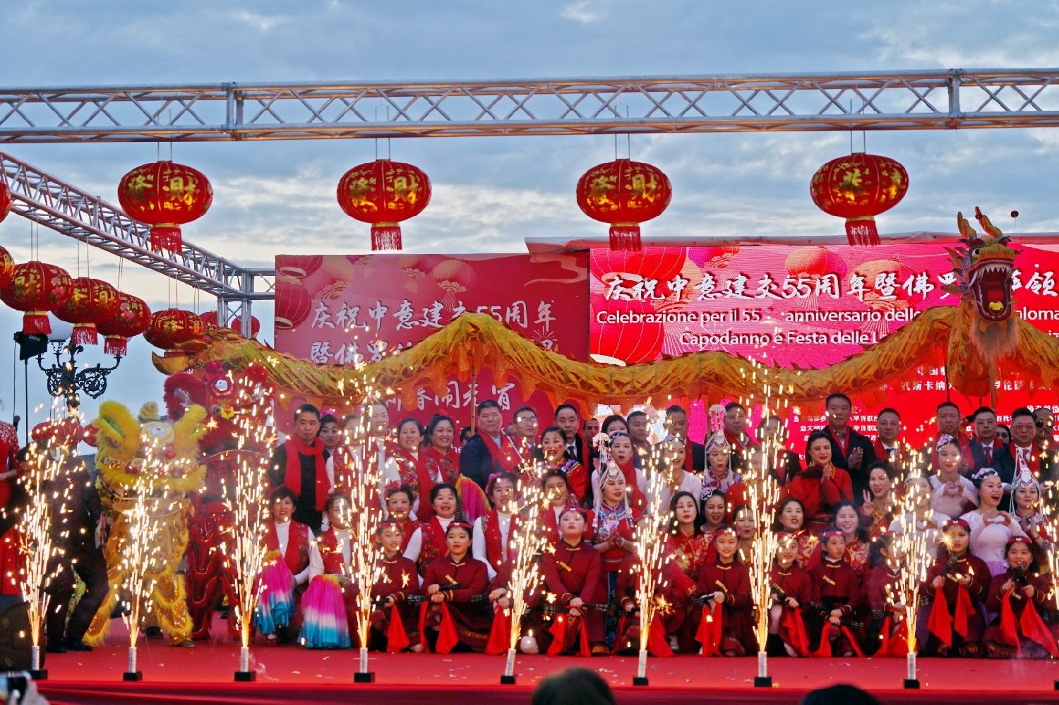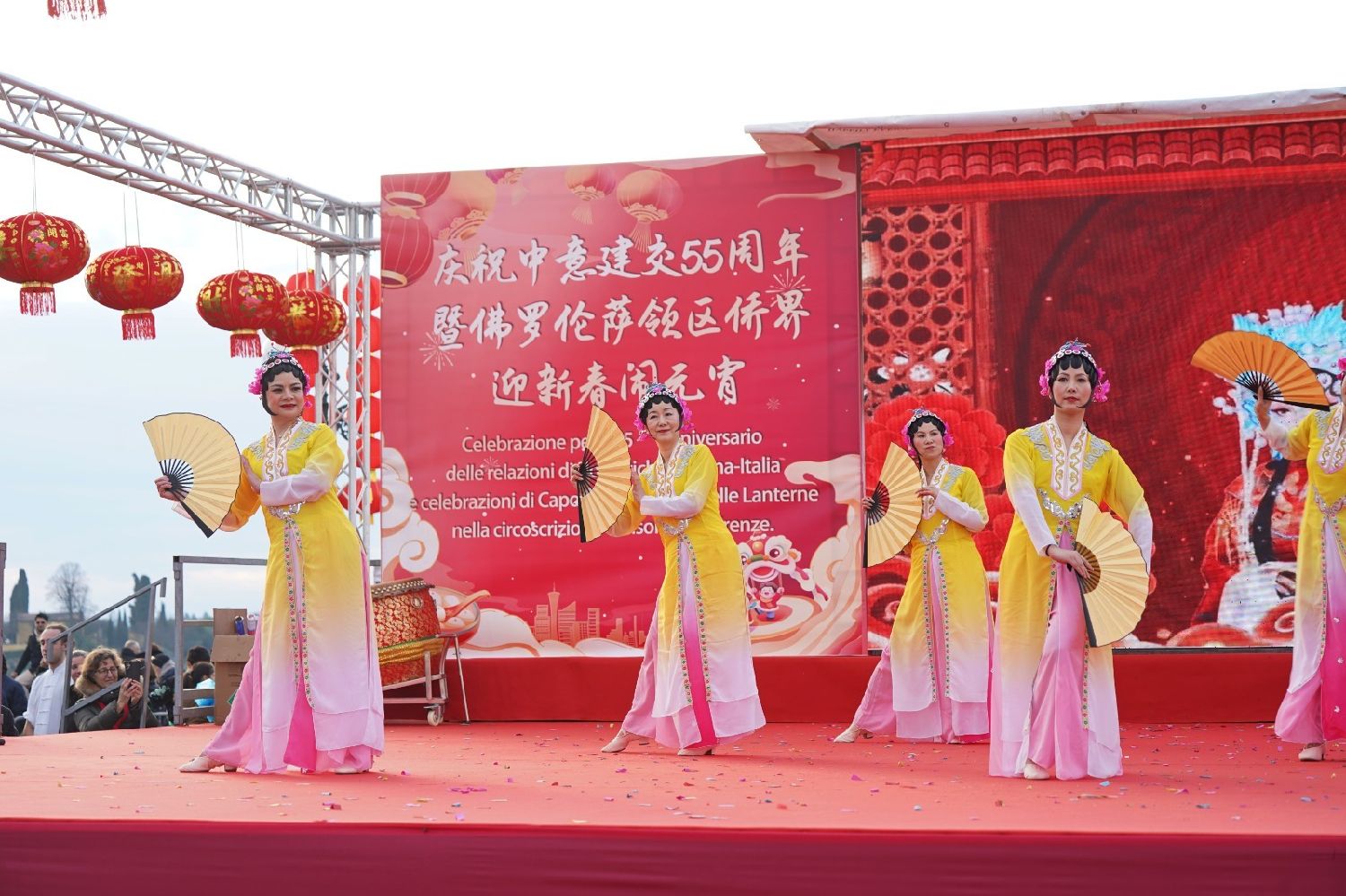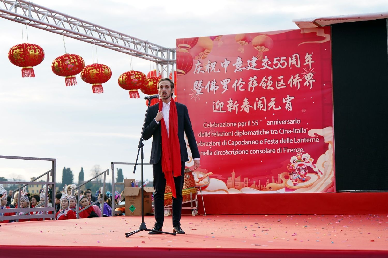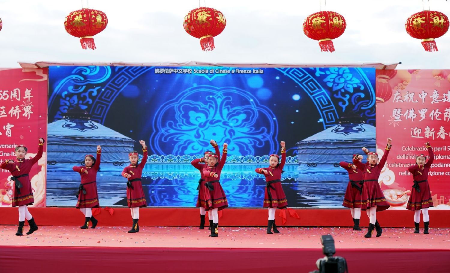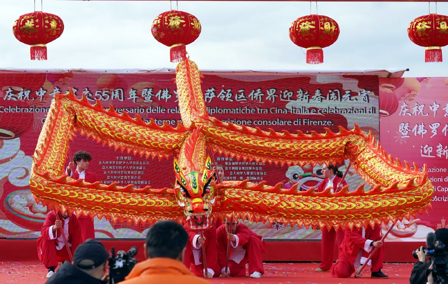 2月9日下午,意大利佛罗伦萨的米开朗基罗广场(Piazzale Michelangelo,华人俗称“皇帝山”)洋溢着浓厚的节日气氛,欢声雷动,热闹非凡。一场盛大的庆祝活动在此隆重上演,这不仅是佛罗伦萨领区侨界欢度新春、共闹元宵的年度盛典,更是纪念中意建交55周年的重要时刻。虽然活动当天上午一度下起了雨,但午后阳光终于普照,给广场增添了融融暖意。四处悬挂的红灯笼,寓意着喜庆与团圆,让现场沉浸在浓浓的节日氛围中。