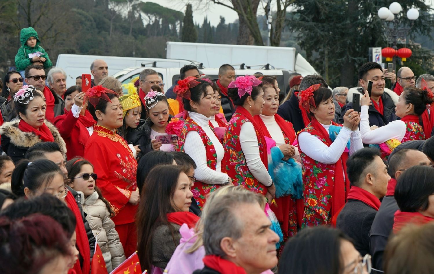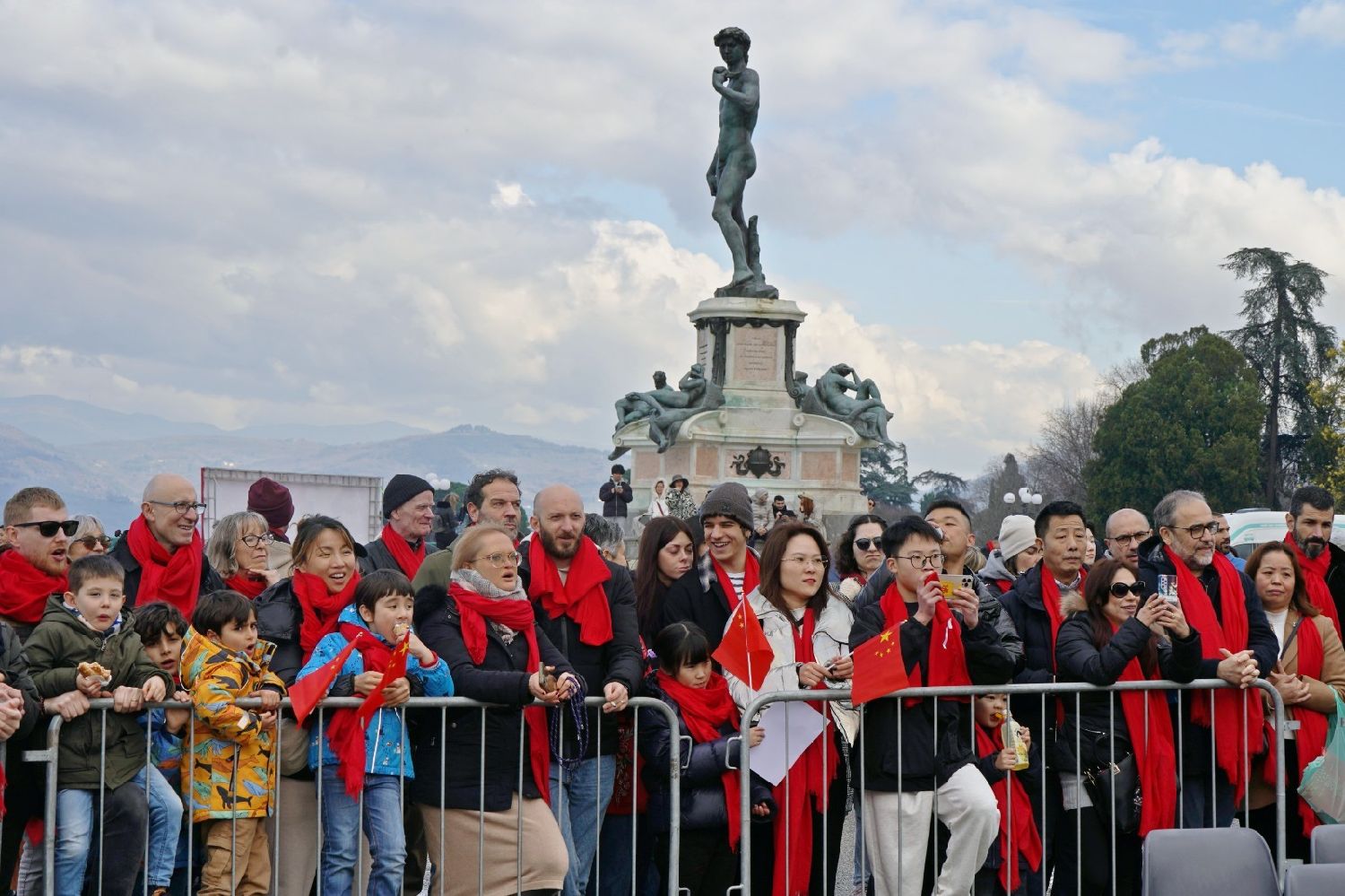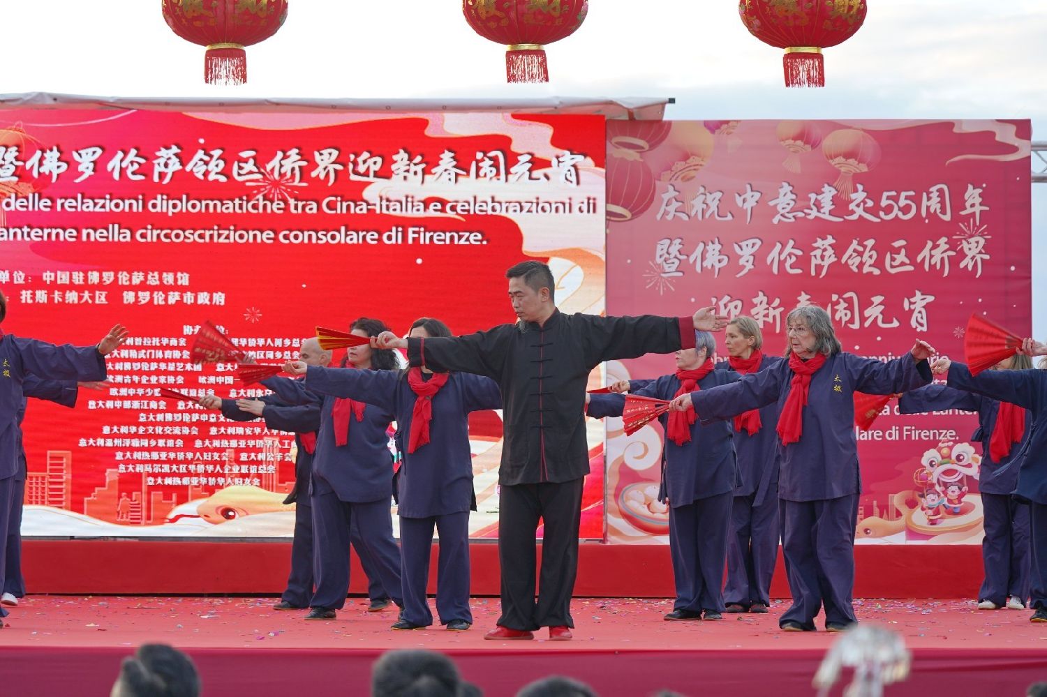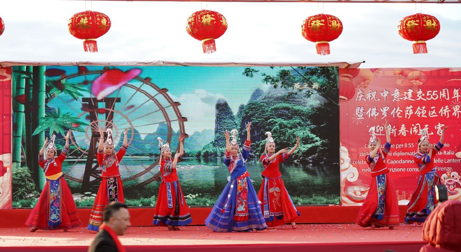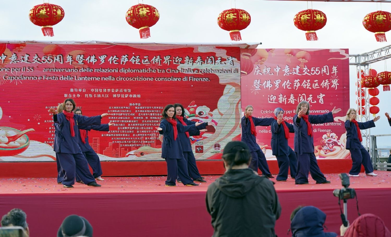 2月9日下午,意大利佛罗伦萨的米开朗基罗广场(Piazzale Michelangelo,华人俗称“皇帝山”)洋溢着浓厚的节日气氛,欢声雷动,热闹非凡。一场盛大的庆祝活动在此隆重上演,这不仅是佛罗伦萨领区侨界欢度新春、共闹元宵的年度盛典,更是纪念中意建交55周年的重要时刻。虽然活动当天上午一度下起了雨,但午后阳光终于普照,给广场增添了融融暖意。四处悬挂的红灯笼,寓意着喜庆与团圆,让现场沉浸在浓浓的节日氛围中。