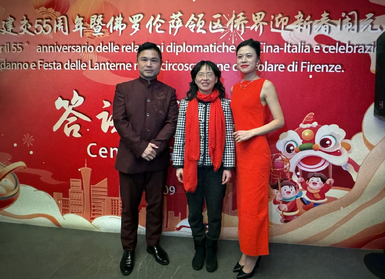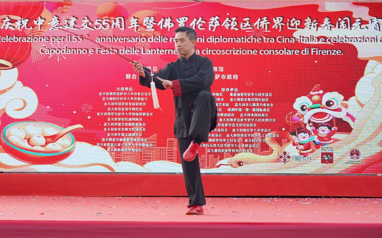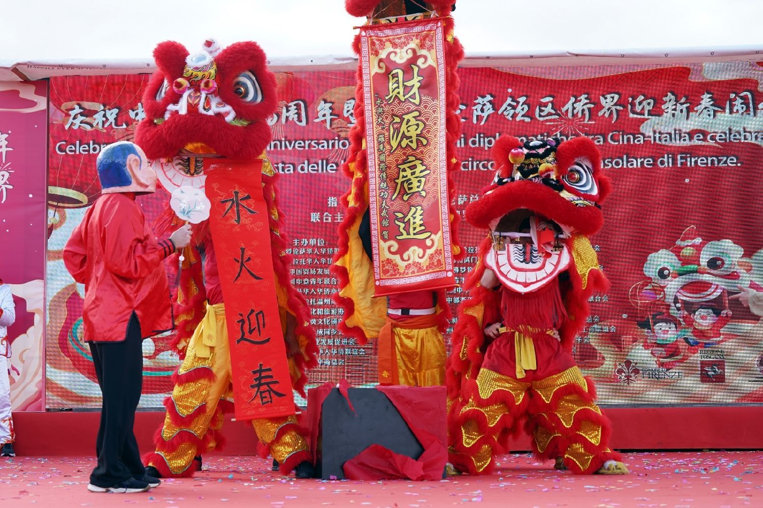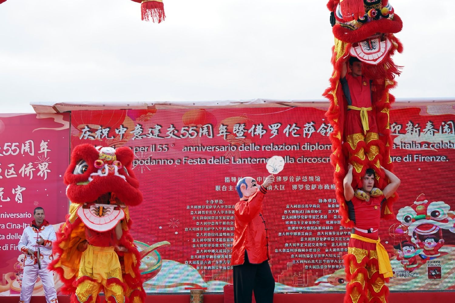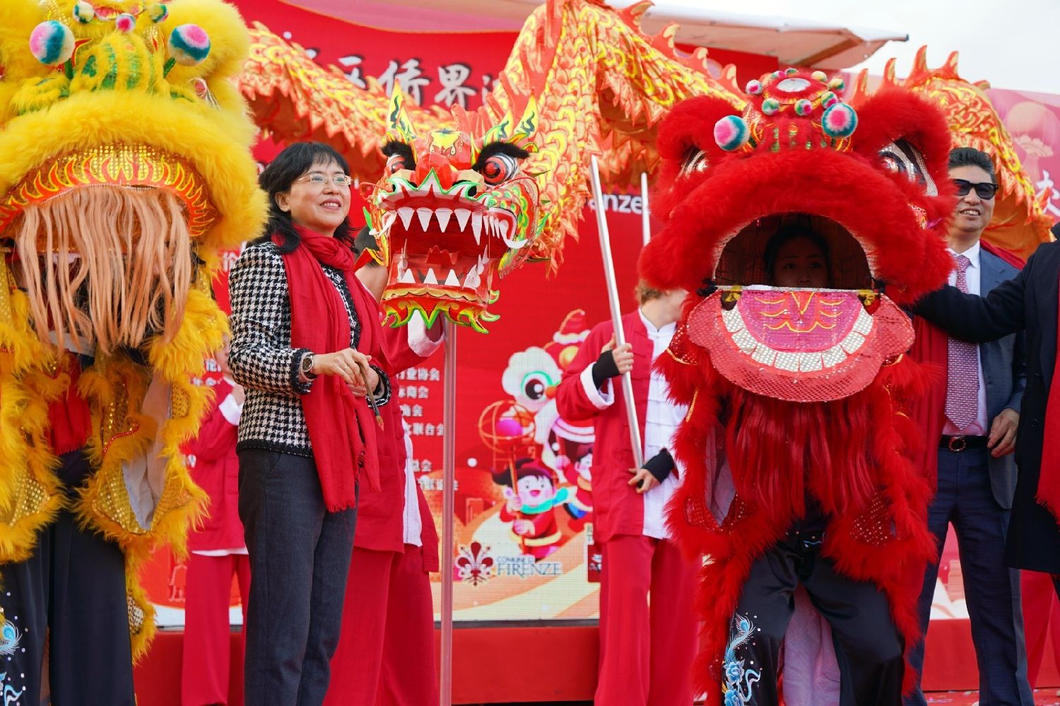中国驻佛罗伦萨总领事尹琦、欧洲议会议员Dario Nardella、佛罗伦萨市长代表Giovanni Bettarini、意大利中国文化和旅游协会会长夏文华、意大利中部文成同乡会会长周建华、意大利西海岸华商总会会长蔡志敏、意大利西部六省一市华侨华人联谊会会长吴永忠、意大利普拉托温州商会监事长南松尧等共同登台,为舞狮点睛。
