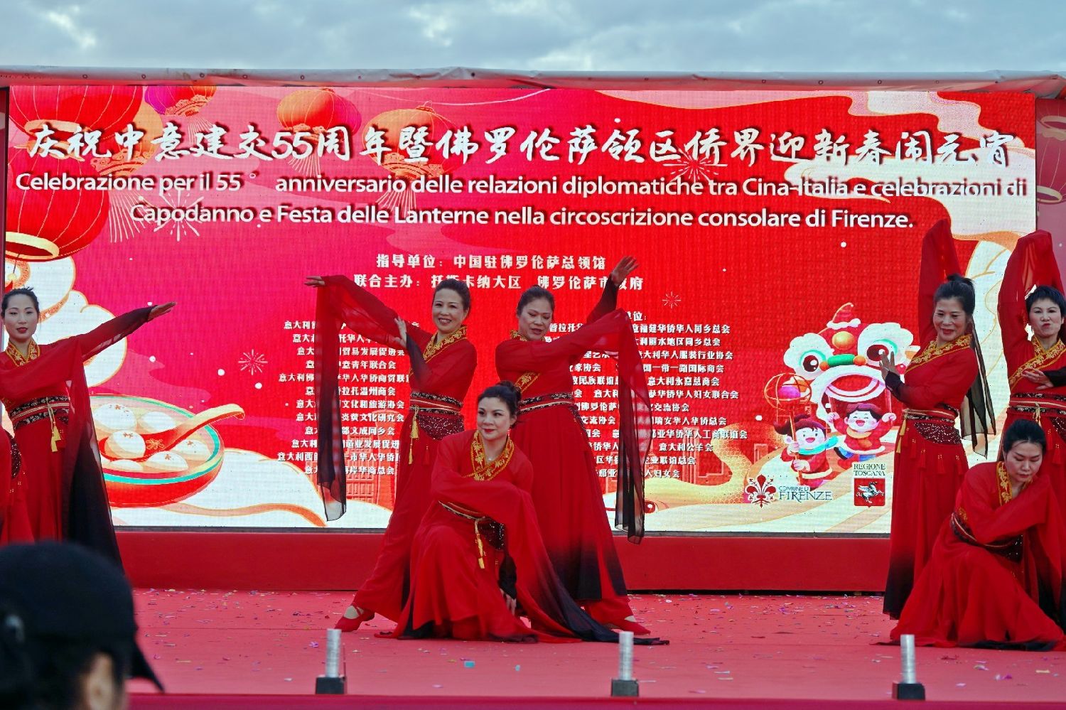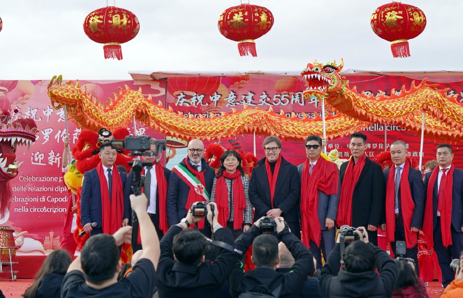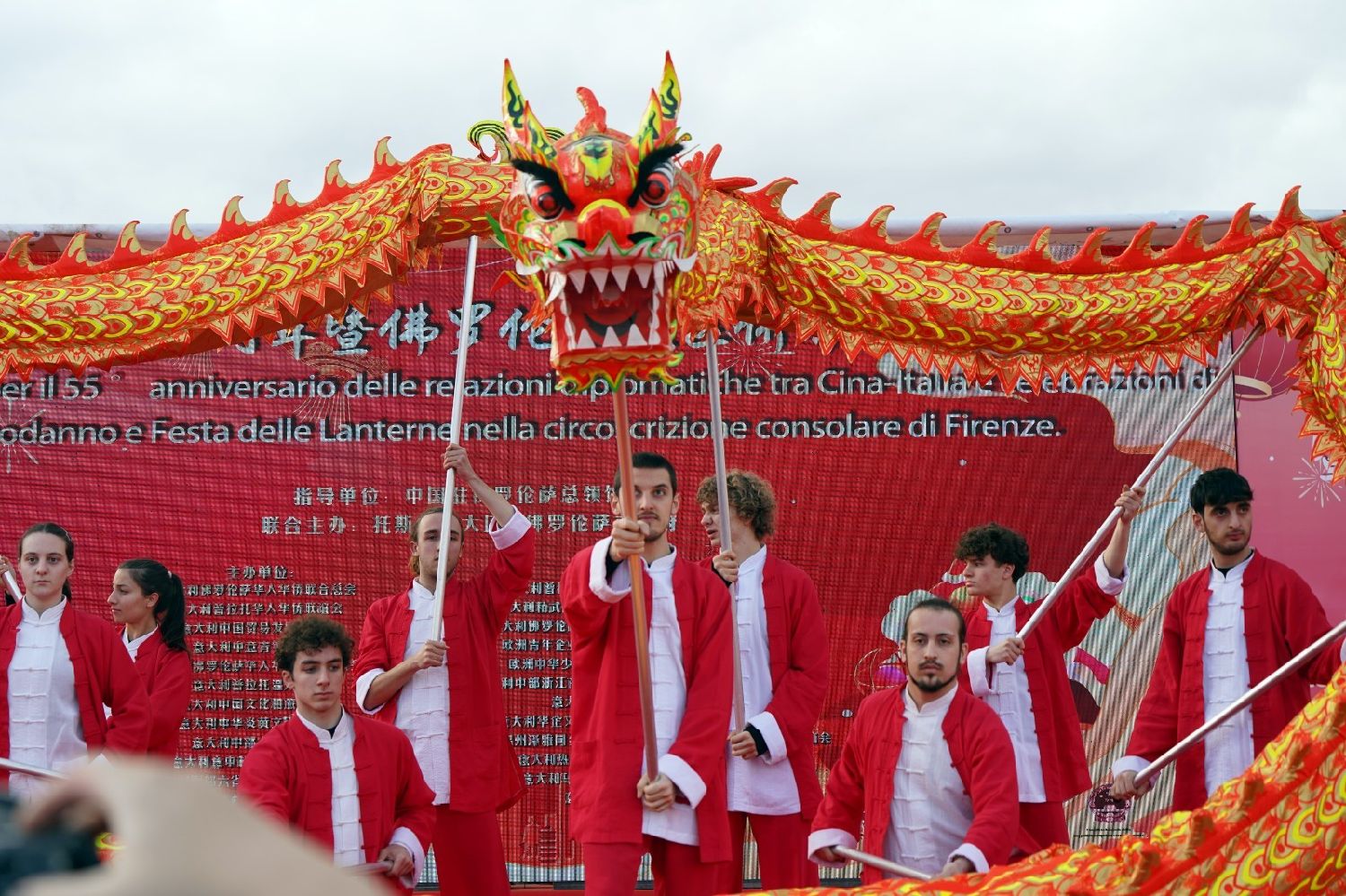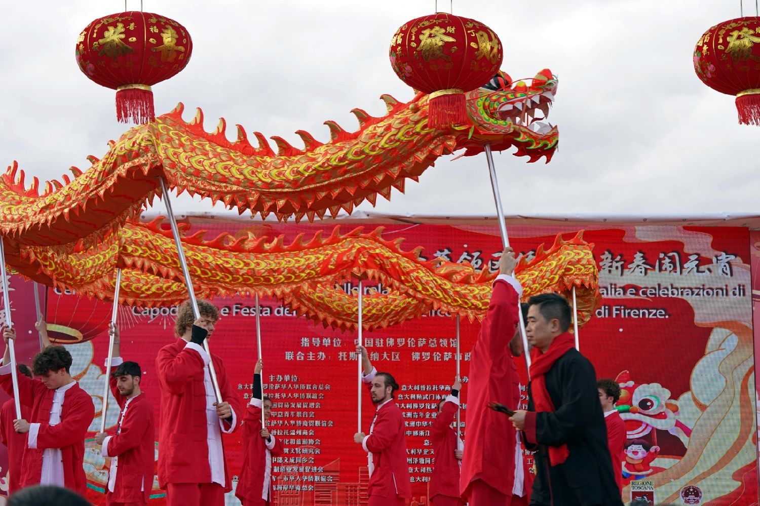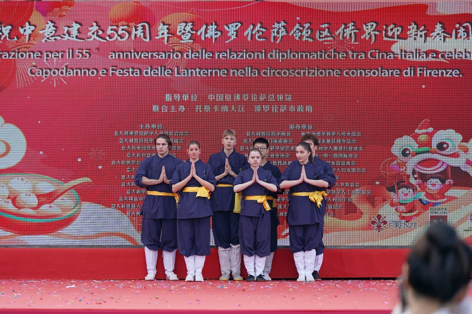 中国驻佛罗伦萨总领事尹琦、欧洲议会议员Dario Nardella、佛罗伦萨市长代表Giovanni Bettarini、意大利中国文化和旅游协会会长夏文华、意大利中部文成同乡会会长周建华、意大利西海岸华商总会会长蔡志敏、意大利西部六省一市华侨华人联谊会会长吴永忠、意大利普拉托温州商会监事长南松尧等共同登台,为舞狮点睛。