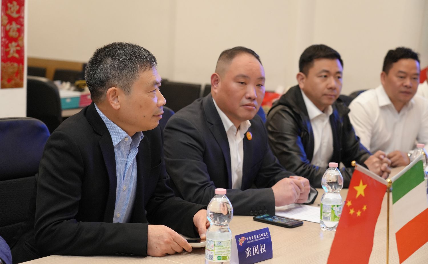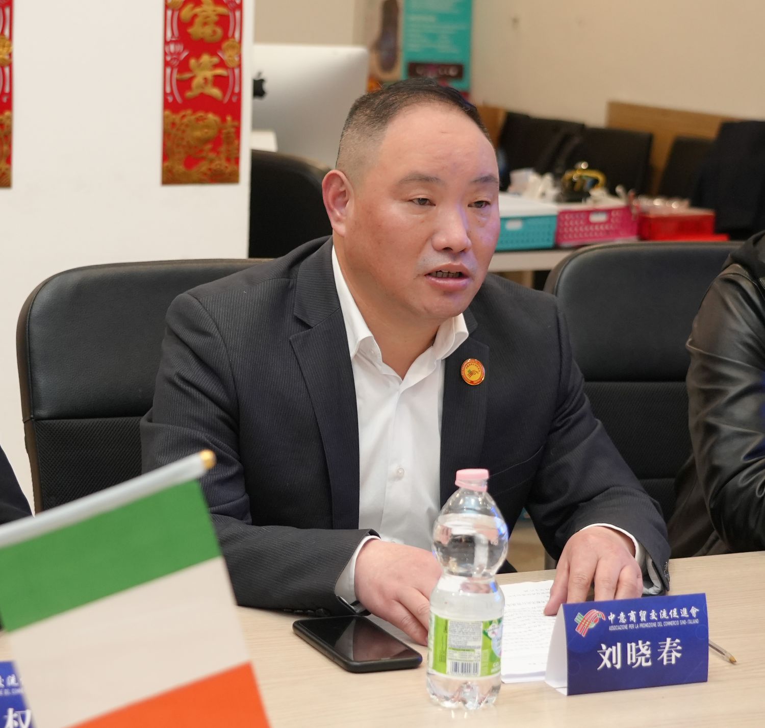 座谈会由中意商贸交流促进会理事长刘志静主持,会长刘晓春致欢迎词。刘晓春向考察团详细介绍了促进会的发展历程与核心宗旨:“促进会自2012年成立以来,始终以‘推动华商健康发展、促进中意经贸合作’为使命,扎根米兰这片充满活力的土地。十年来,我们团结15万米兰华侨华人,在加工贸易、商业服务等领域开拓进取,不仅助力侨胞融入当地社会,更成为中意经贸合作的重要桥梁。”他特别提及促进会通过春节文化活动、商贸论坛等形式,向意大利社会传播中华文化,讲述“中国故事”,如今已发展成为拥有200多名成员、覆盖多领域的综合性侨团,赢得中国驻米兰总领馆及兄弟侨团的高度认可。