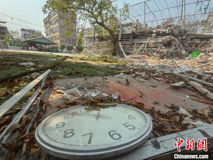 当地时间4月2日,因地震造成教学楼坍塌的缅甸曼德勒孔教学校北校区现场,一台时钟“躺”在废墟中,时间定格在地震发生的一刻。
