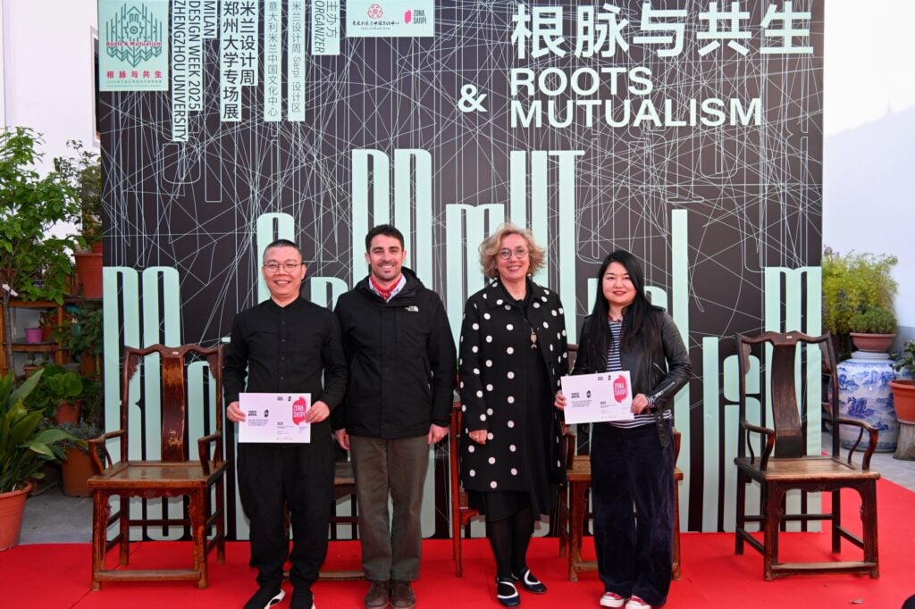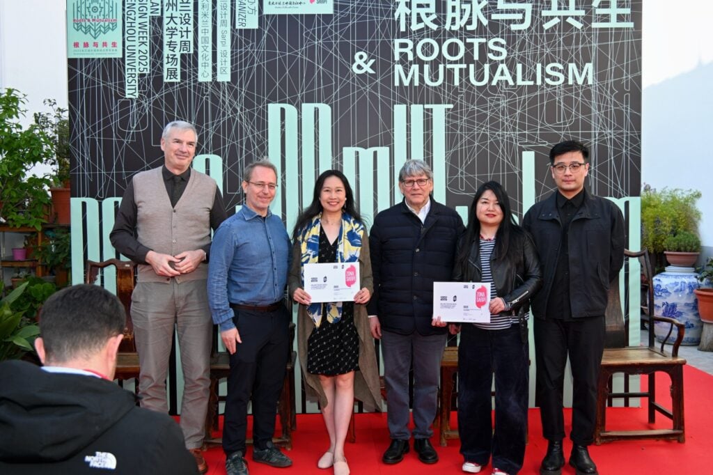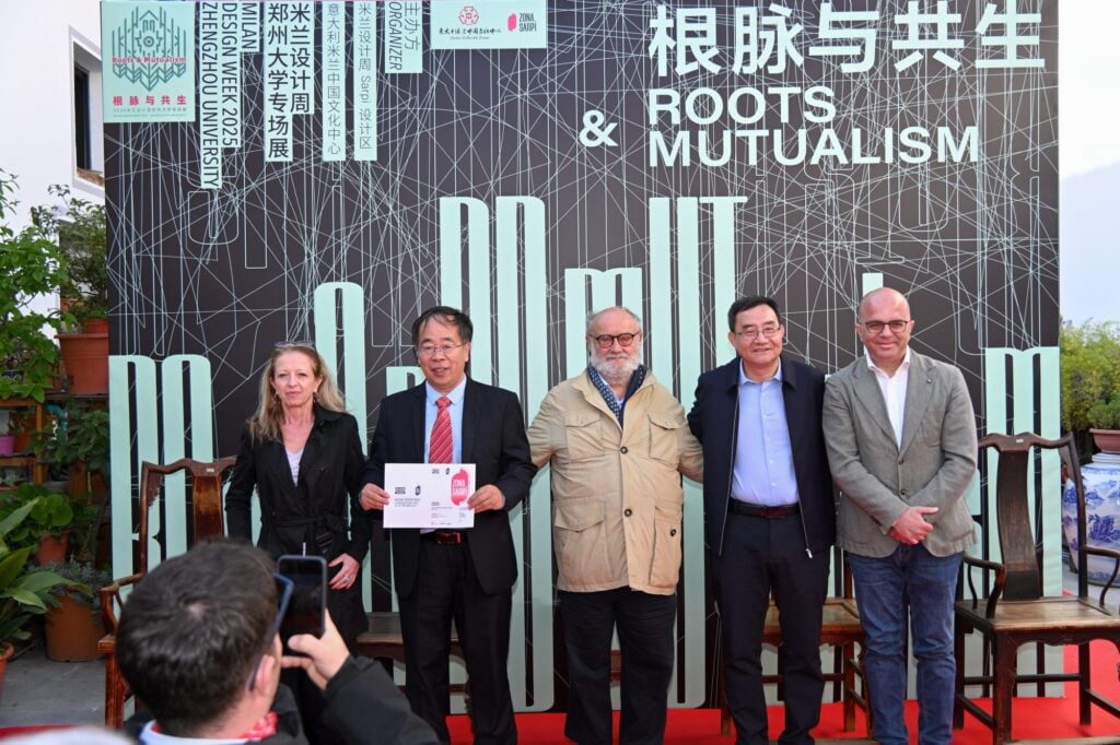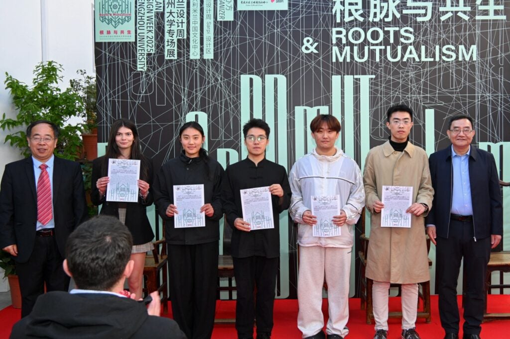 作为对展览贡献的高度认可,米兰巴兰扎泰市市长Luca Elia、Sarpi设计区负责人Luca Fois以及米兰省教育厅厅长Letizia Affatato共同为郑州大学颁发“2025米兰设计周Sarpi设计区最佳组织奖”。郑州大学代表刘永杰与朱建良上台领奖。