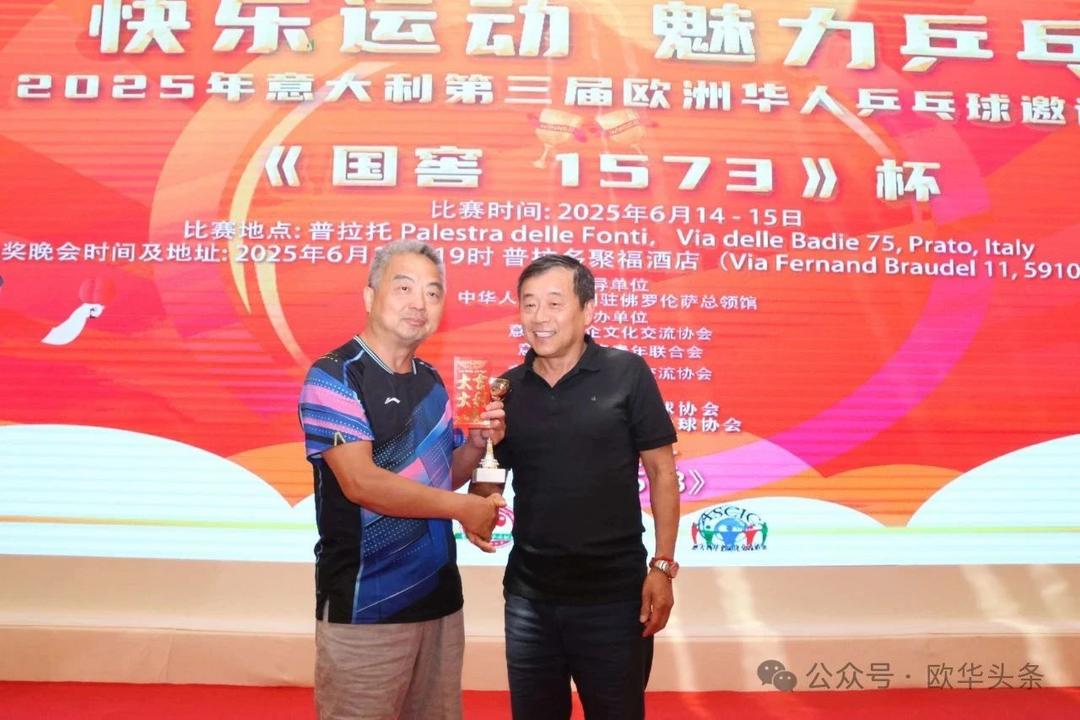 颁奖晚会由意大利华企文化交流协会秘书长吴育明与知名双语主持人涂晓菲共同主持。晚宴开场,全体来宾起立,现场庄严奏响中意两国国歌,气氛庄重肃穆,也为整场盛典定下厚重基调。意大利佛罗伦萨领区各侨社代表、华侨华人与来自欧洲各国、意大利各地区的中外乒乓球友、意大利各界友人欢聚一堂。晚宴上,主办方代表依次为个人单打A组与B组、团体赛前三名获奖者逐一颁奖,肯定了他们在赛场上的拼搏与风采。