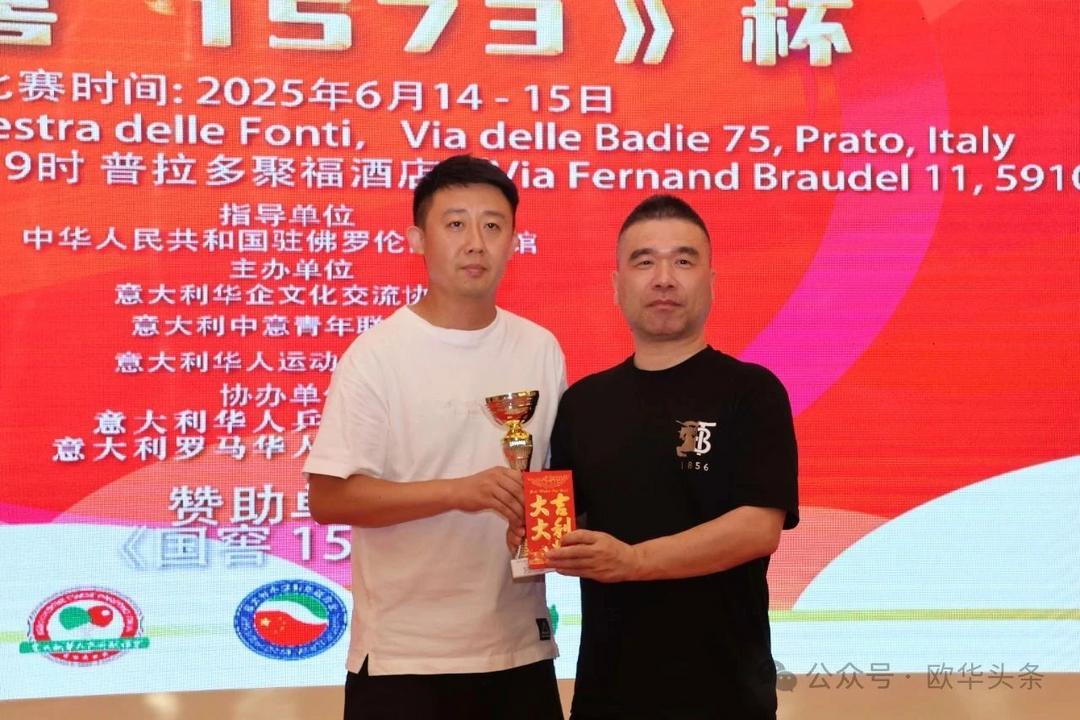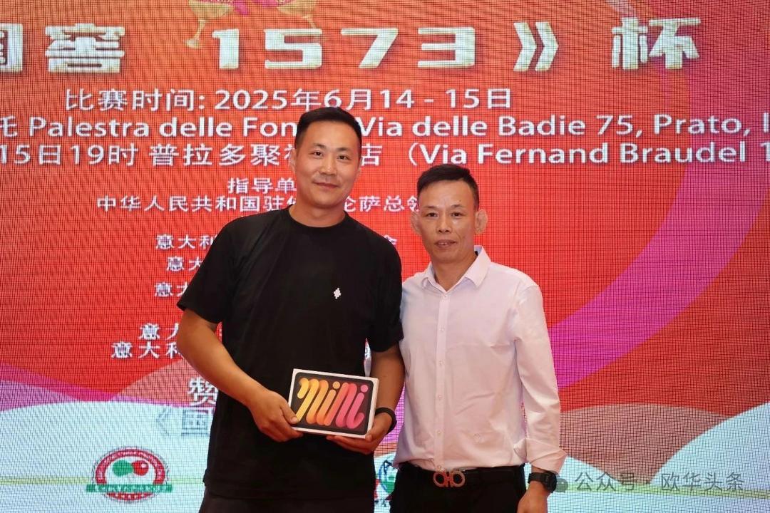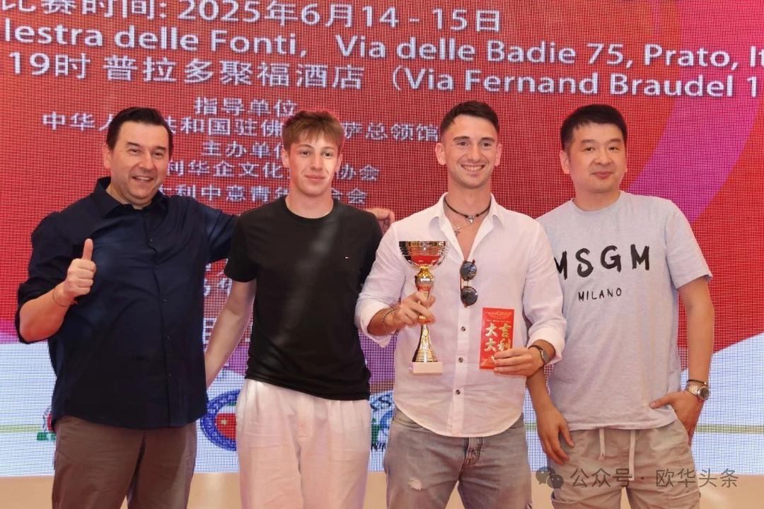 意大利华企文化交流协会会长曹隆科向个人A组第一名的意大利普拉托华人俱乐部的选手刘文宇颁奖。