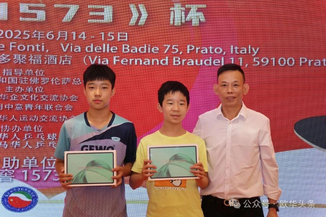 意大利华人运动交流协会会长薛胜玉向为两位年仅12岁和13岁的年轻选手颁奖,鼓励他们再接再厉。