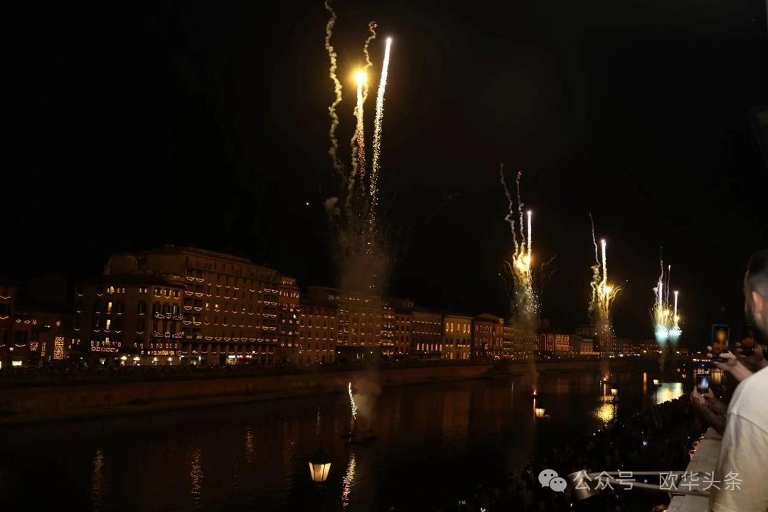 烟花秀于当晚11点准时上演,在阿尔诺河上的浮动平台上燃起璀璨火花,持续20分钟的高空烟火将节日气氛推向高潮。炫目的光彩点亮夜空,映照在万千游人惊叹的目光中。两岸观众摩肩接踵,现场气氛热烈,几近“水泄不通”。