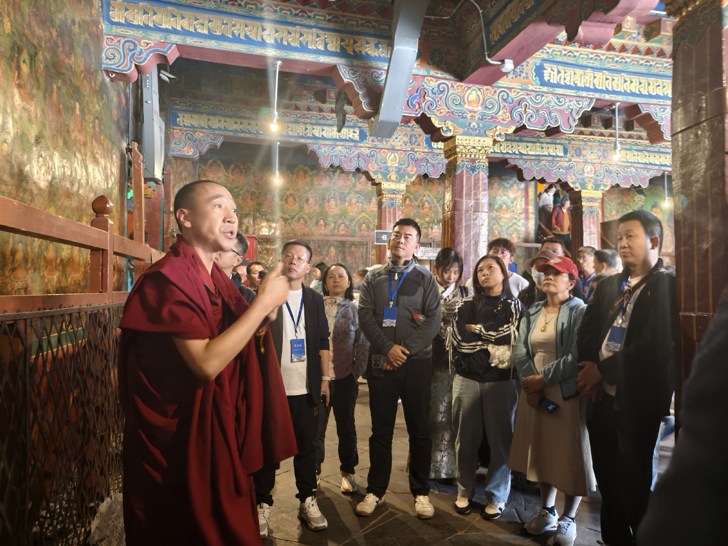 随后,代表团来到藏传佛教圣地大昭寺。该寺由松赞干布主持修建,寺内供奉着文成公主从长安带来的释迦牟尼12岁等身像,千年来吸引无数信徒朝拜。媒体代表们绕行八廓街,观察虔诚的转经人群,并参观寺内的“唐蕃会盟碑”,了解汉藏友好的历史见证。