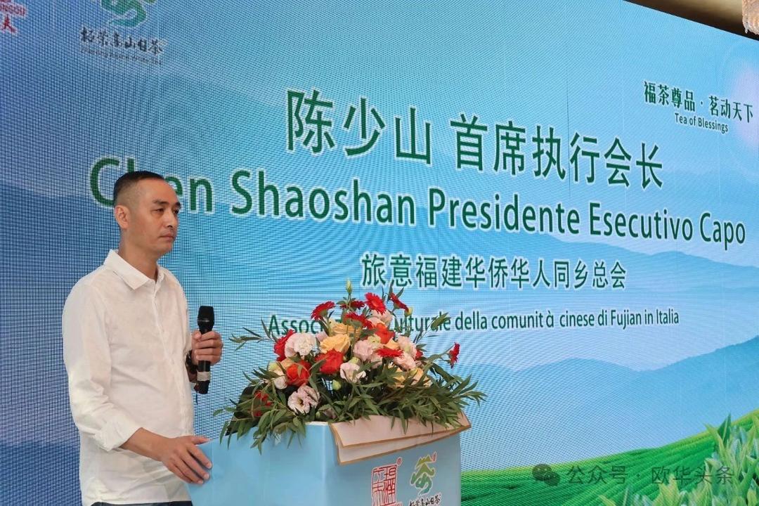 ▲旅意福建华侨华人同乡总会首席执行会长陈少山发表讲话。