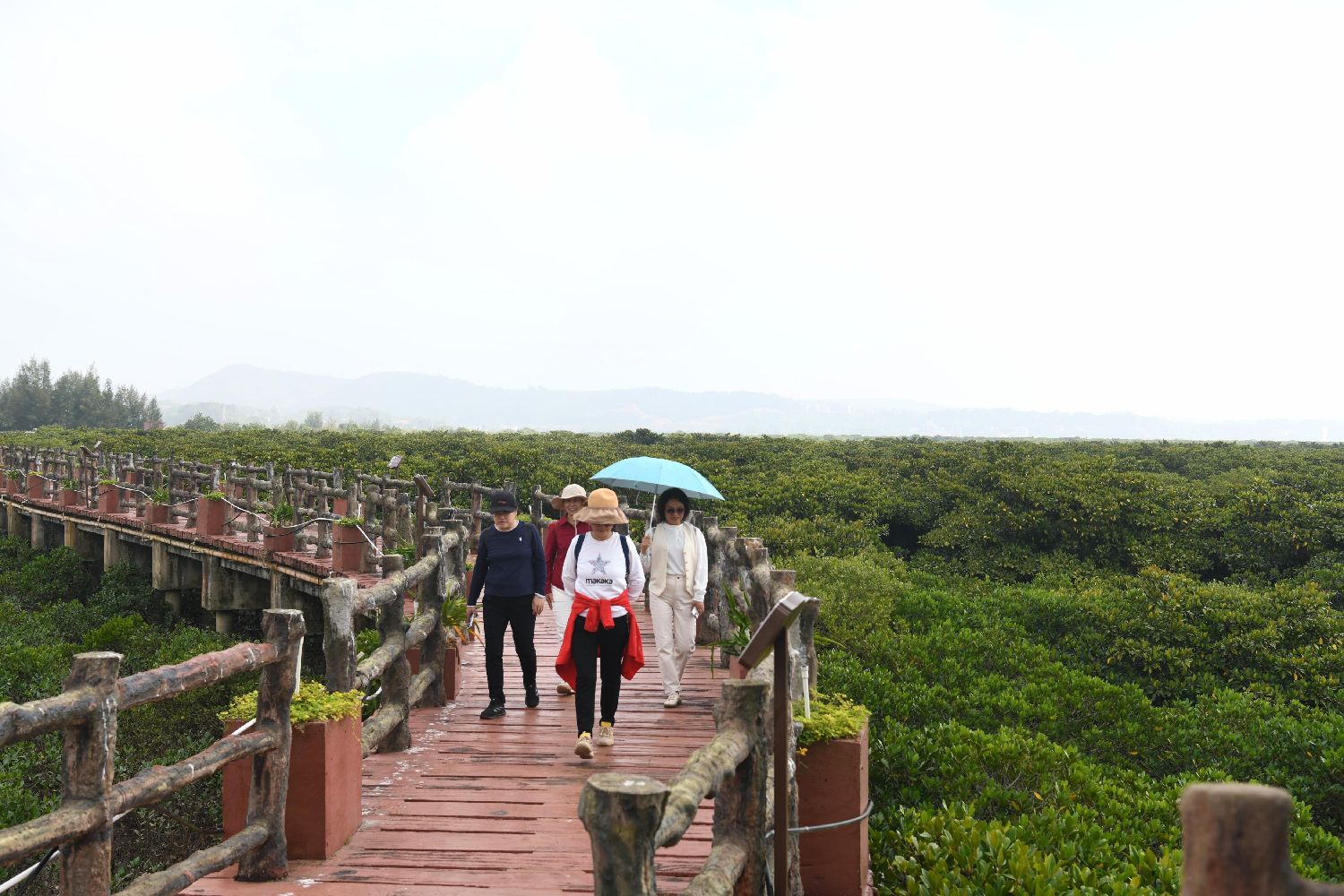 图为广西北仑河口国家级自然保护区的红树林湿地美景吸引参观者。翟李强摄