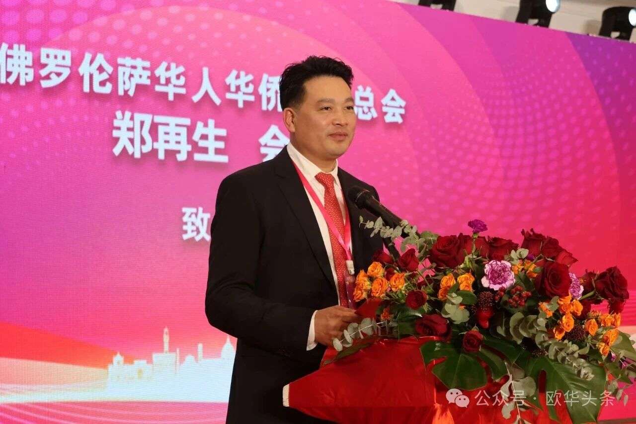 ▲佛罗伦萨华人华侨联合总会会长郑再生致辞。